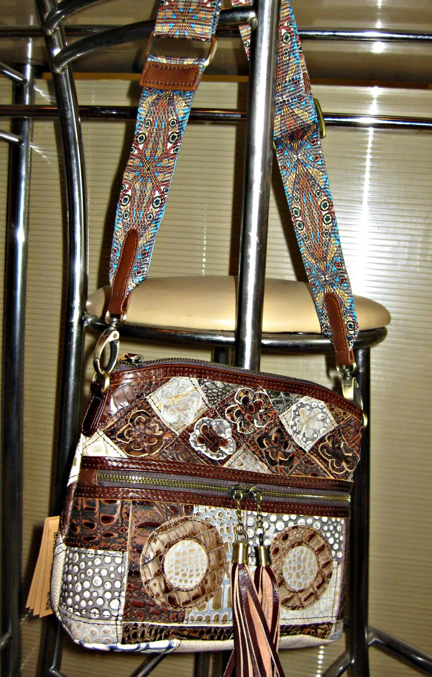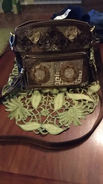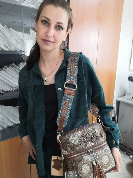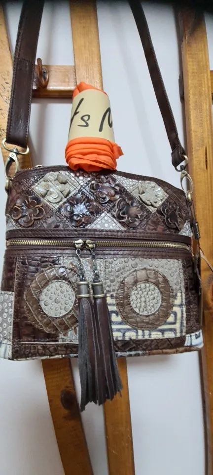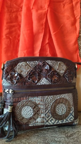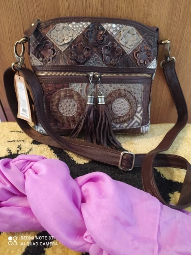 заказывала с красными цветами.. увы.. пришла вся в бежевом цвете.. спас красивый ремень)) сумка на самом деле кожа, очень вместительная не смотря на свой небольшой размер! рекомендую!!!
