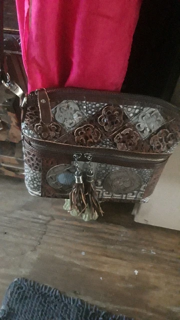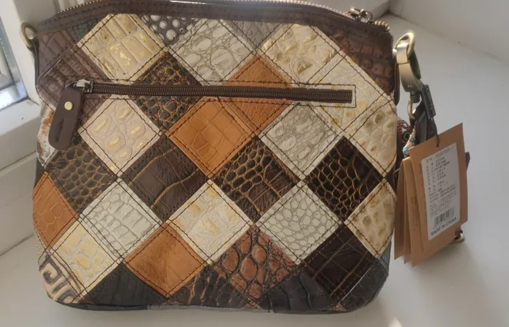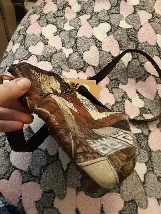 сумка пришла быстро. качество так себе, замок верхний заедает, одна висюлька нормальная, а вот вторая, как будто ее пожевали и выплюнули. внизу залом, возможно потом расправится. Шарфик в подарок был.