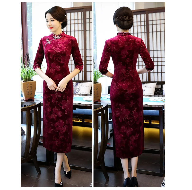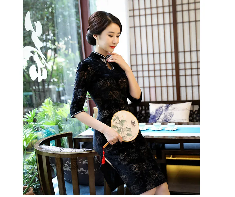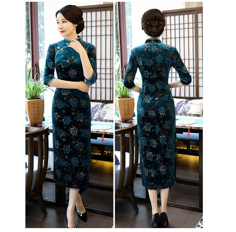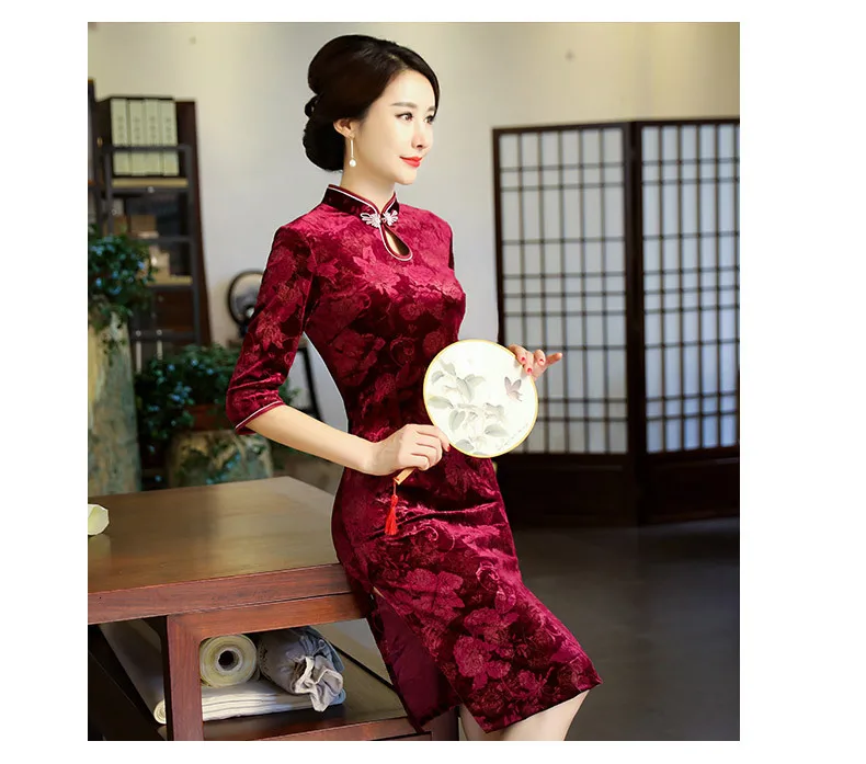Бархатные Длинные платья Sheng Coco, вечернее Ципао, традиционная китайская одежда, рисунок Золотая Роза, Короткое женское Ципао в восточном стиле