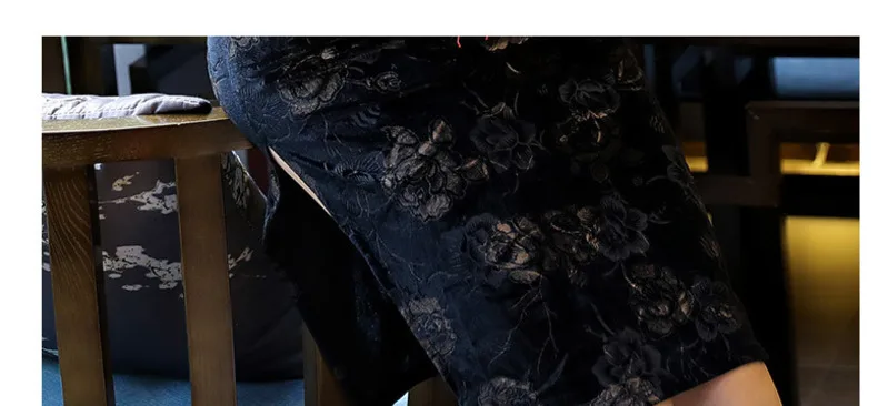 Женское Короткое платье-Ципао, темно-синее кружевное повседневное м...