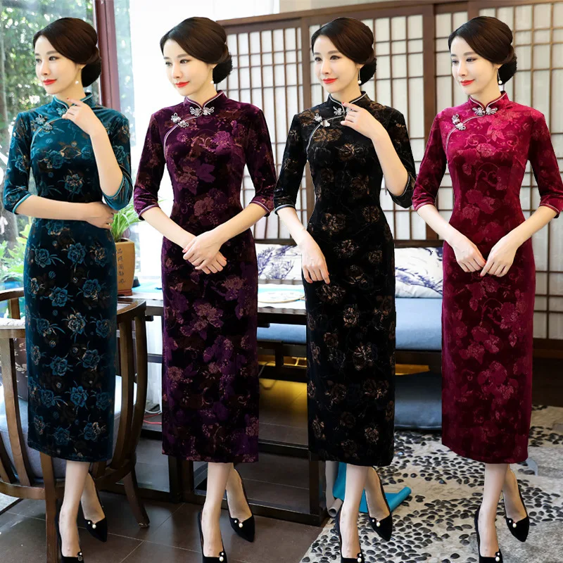 Китайское платье Ципао, длинное шелковое элегантное традиционное пл...