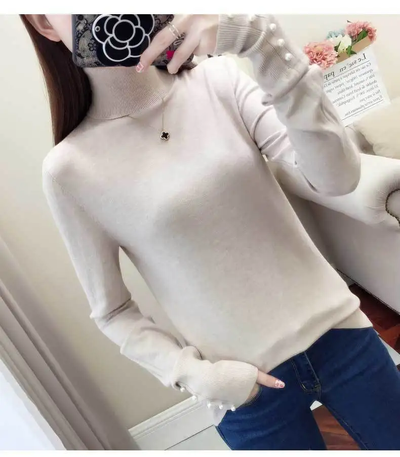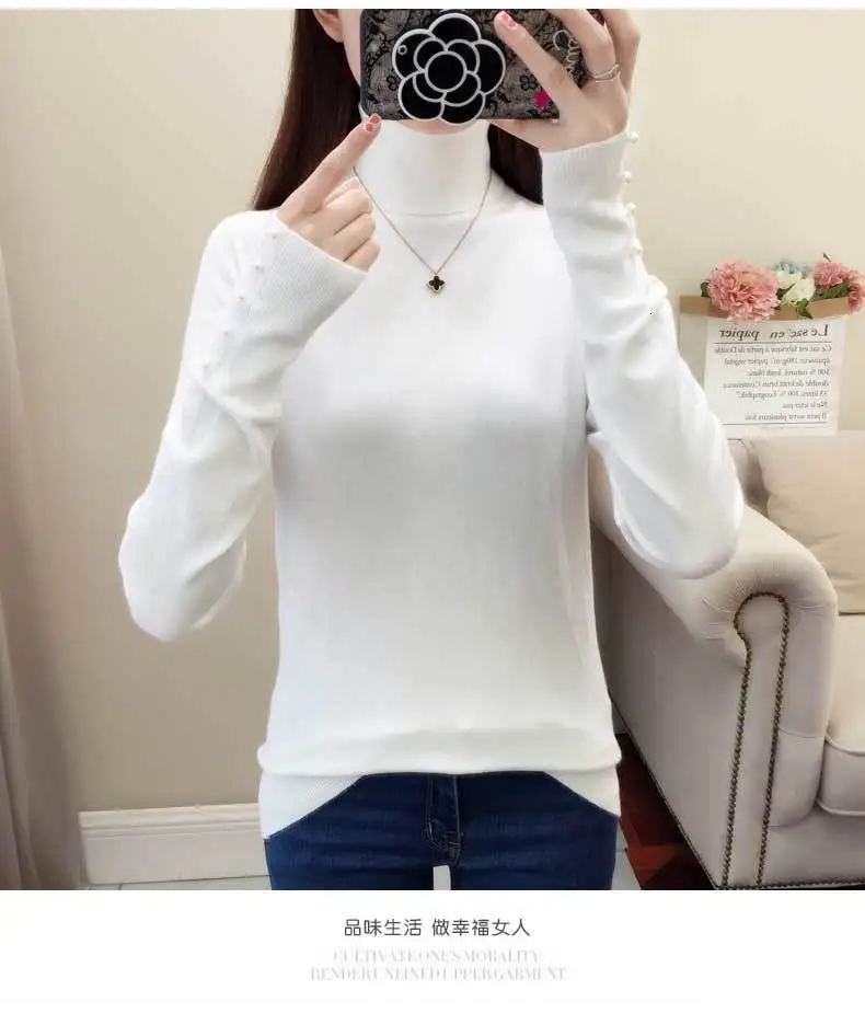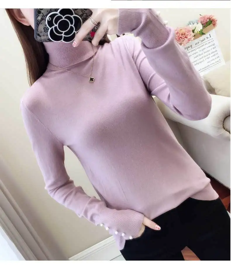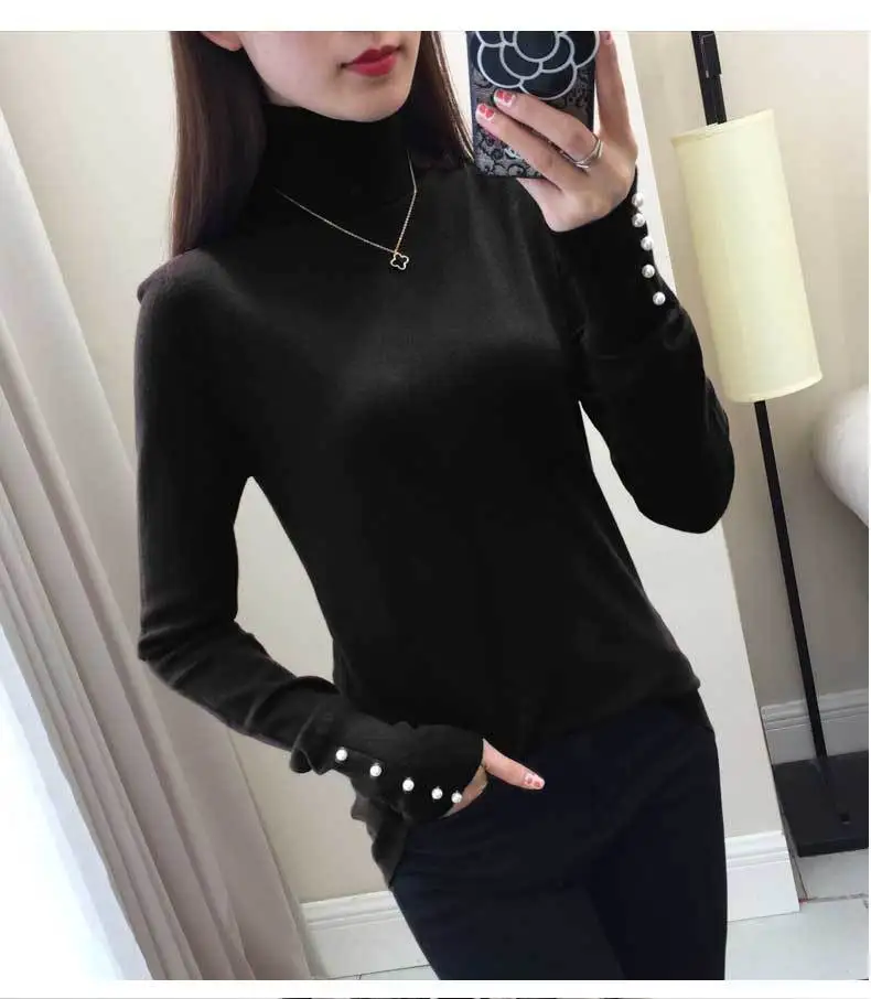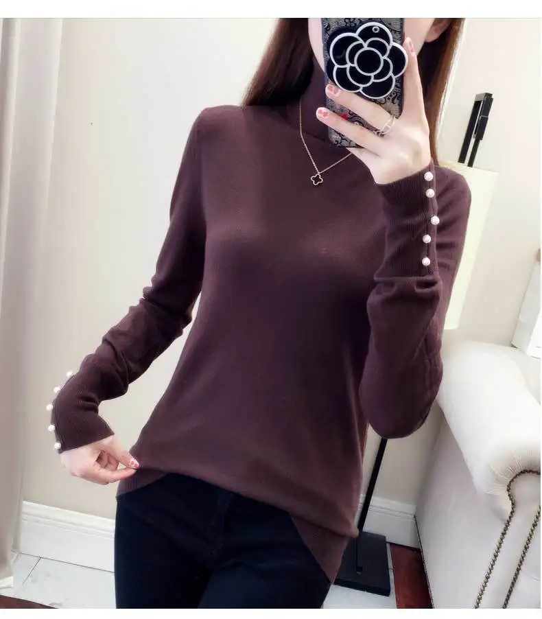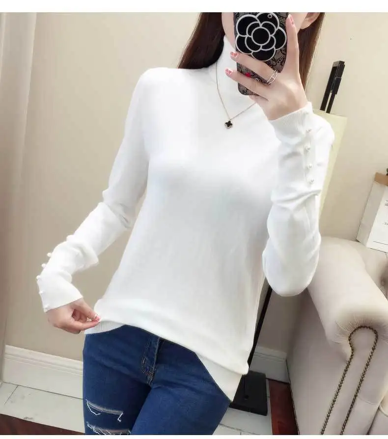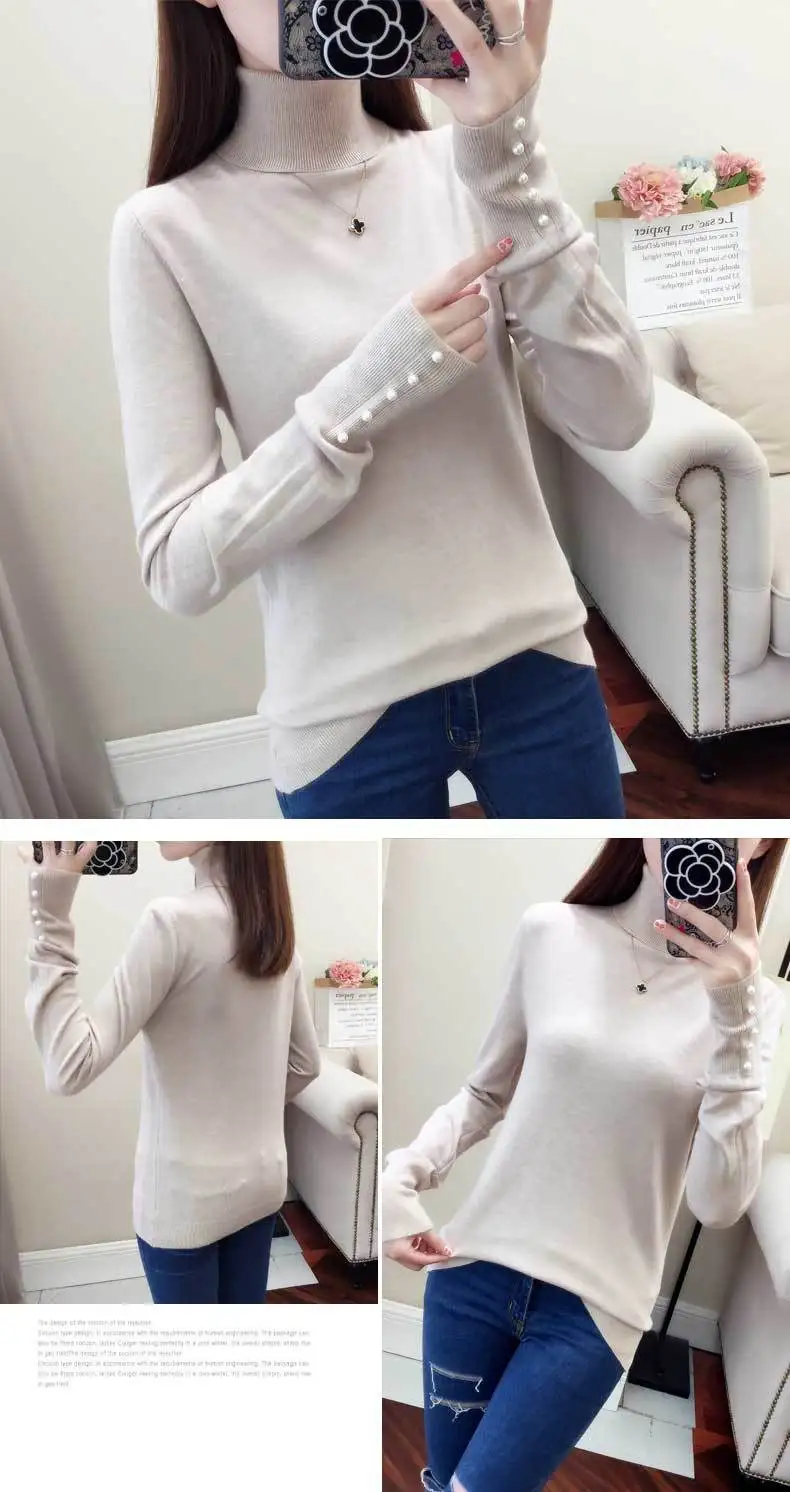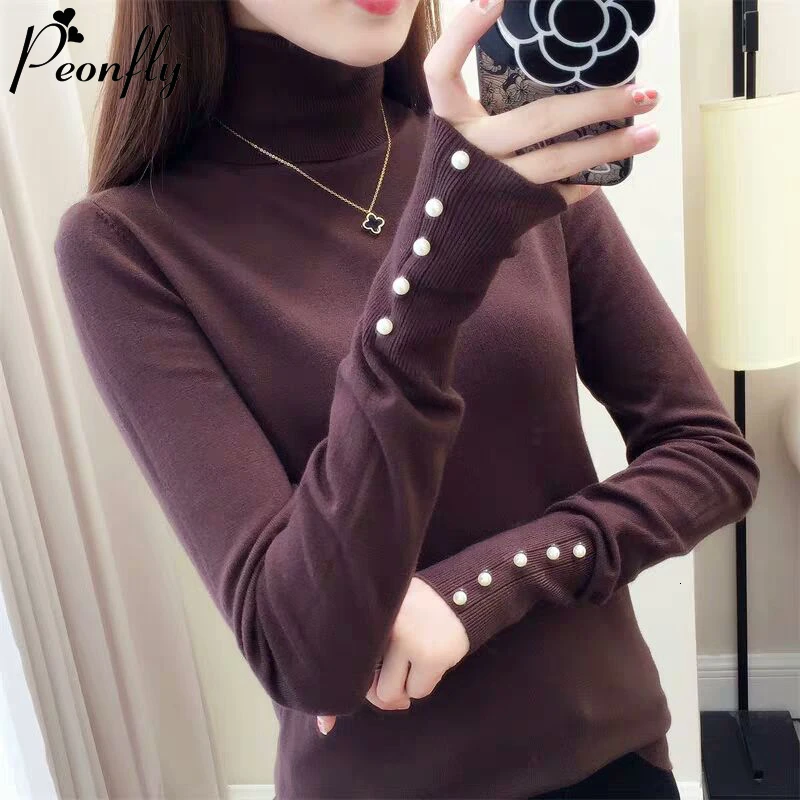 Женский трикотажный свитер-водолазка PEONFLY, повседневный облегающий джемпер с длинным рукавом и мягкими пуговицами, осень 2019