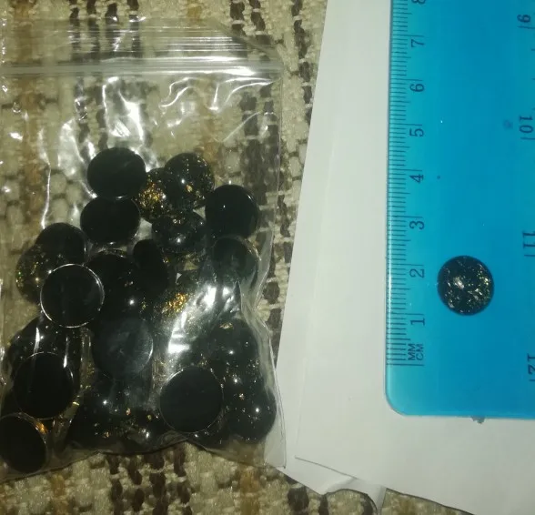прекрасные кабошоны, размер и внешний вид соответствует. я думала что они будут отличаться от фото на сайте, но нет, точно такие же. правда я думала что они внешне будут побольше, но это чисто моя ошибка, есть все заверенные 12мм диаметра