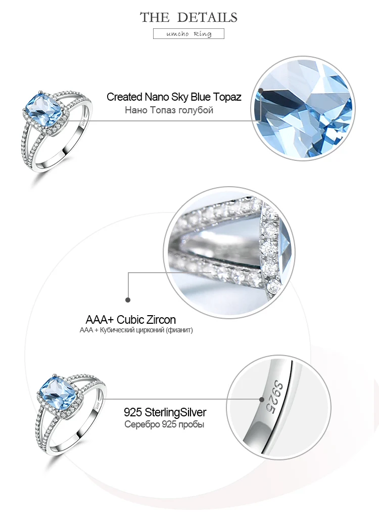 Женские кольца из настоящего серебра UMCHO, обручальное кольцо с нано небесно-голубым топазом из серебра 925 пробы, ювелирные изделия
