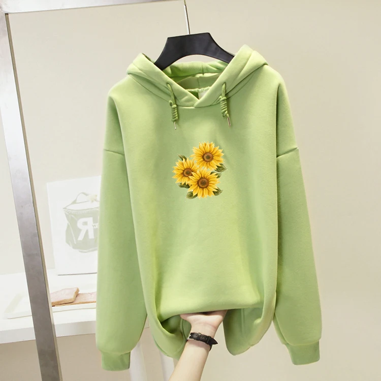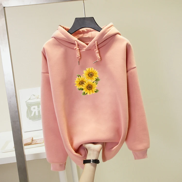 Женская толстовка с капюшоном, розовая Зимняя Толстовка с длинным рукавом, корейский стиль, уличный пуловер большого размера с принтом подсолнухов, S-4XL