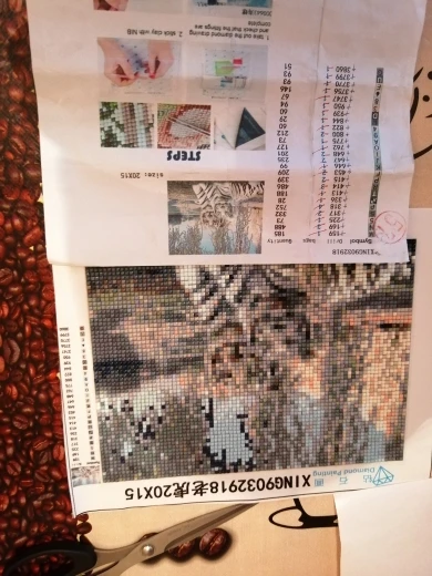 Картина намотана на стразы поэтому очень помята, но это мелочи т. к. у двух цветов не хватает по одному пакету у третьего цвета пакет порван собрала минимум. ну просто обидно и неприятно. надеюсь страз хватит.