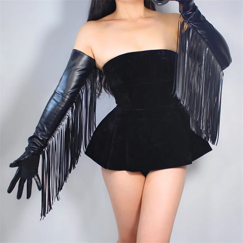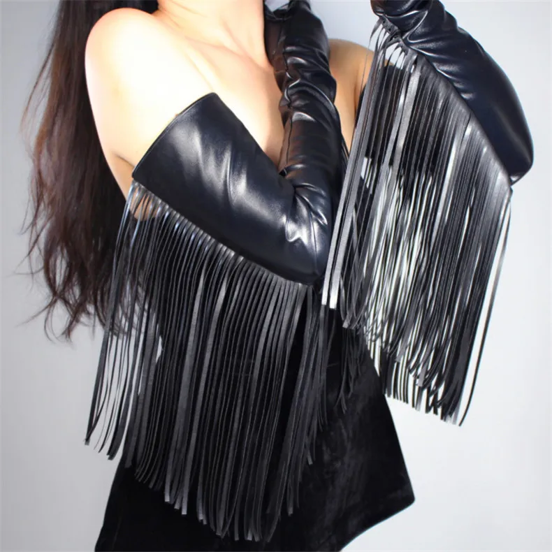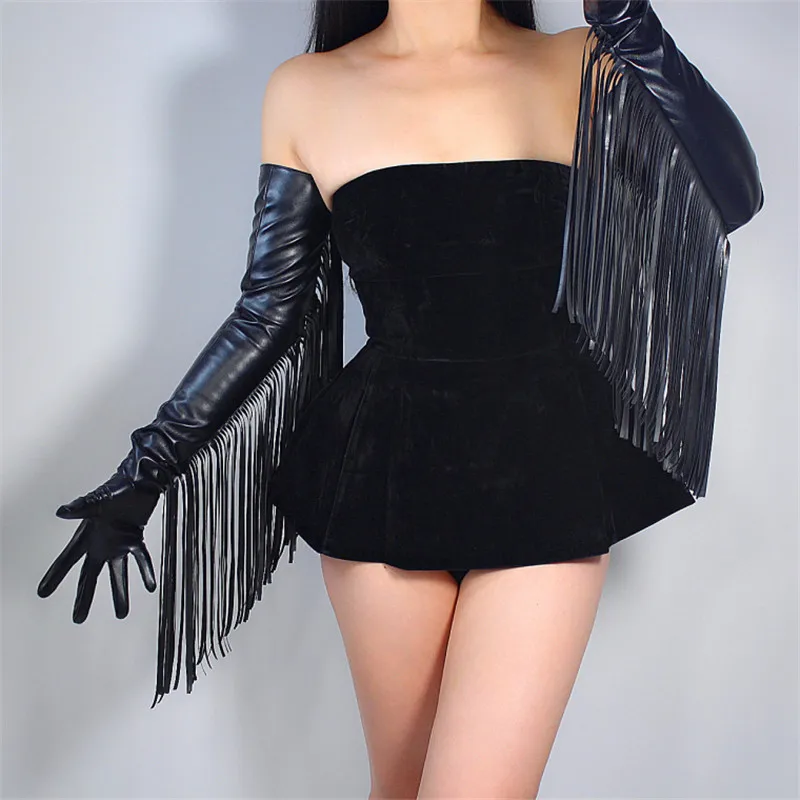 Длинные перчатки TECH искусственная кожа PU 28 "70 см черные очень длинные Бахрома Кисточкой руки женские перчатки сенсорный экран WPU168