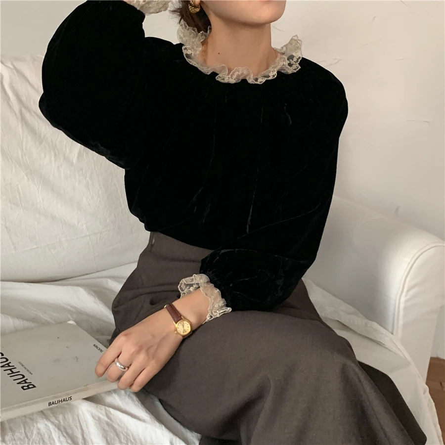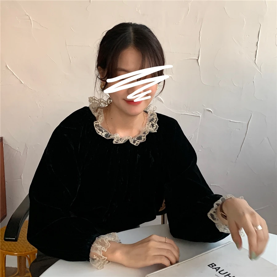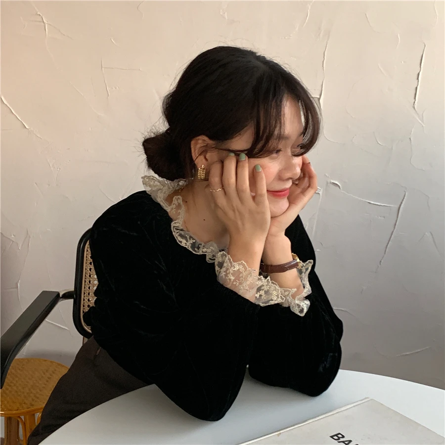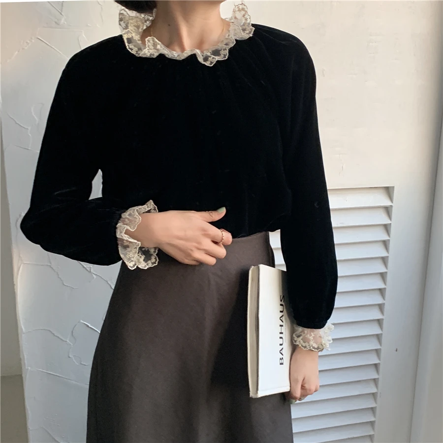 Осенне-зимние женские блузки и топы, Элегантные корейские однотонные офисные блузки с длинным рукавом и кружевной отделкой с воротником-стойкой