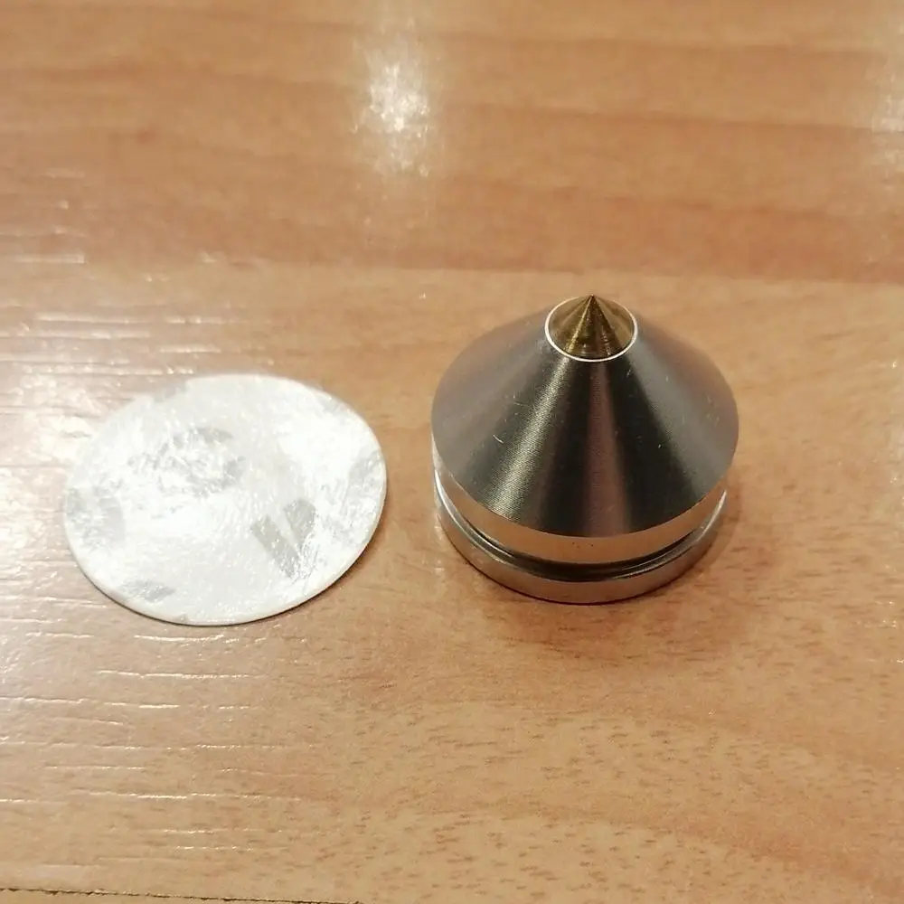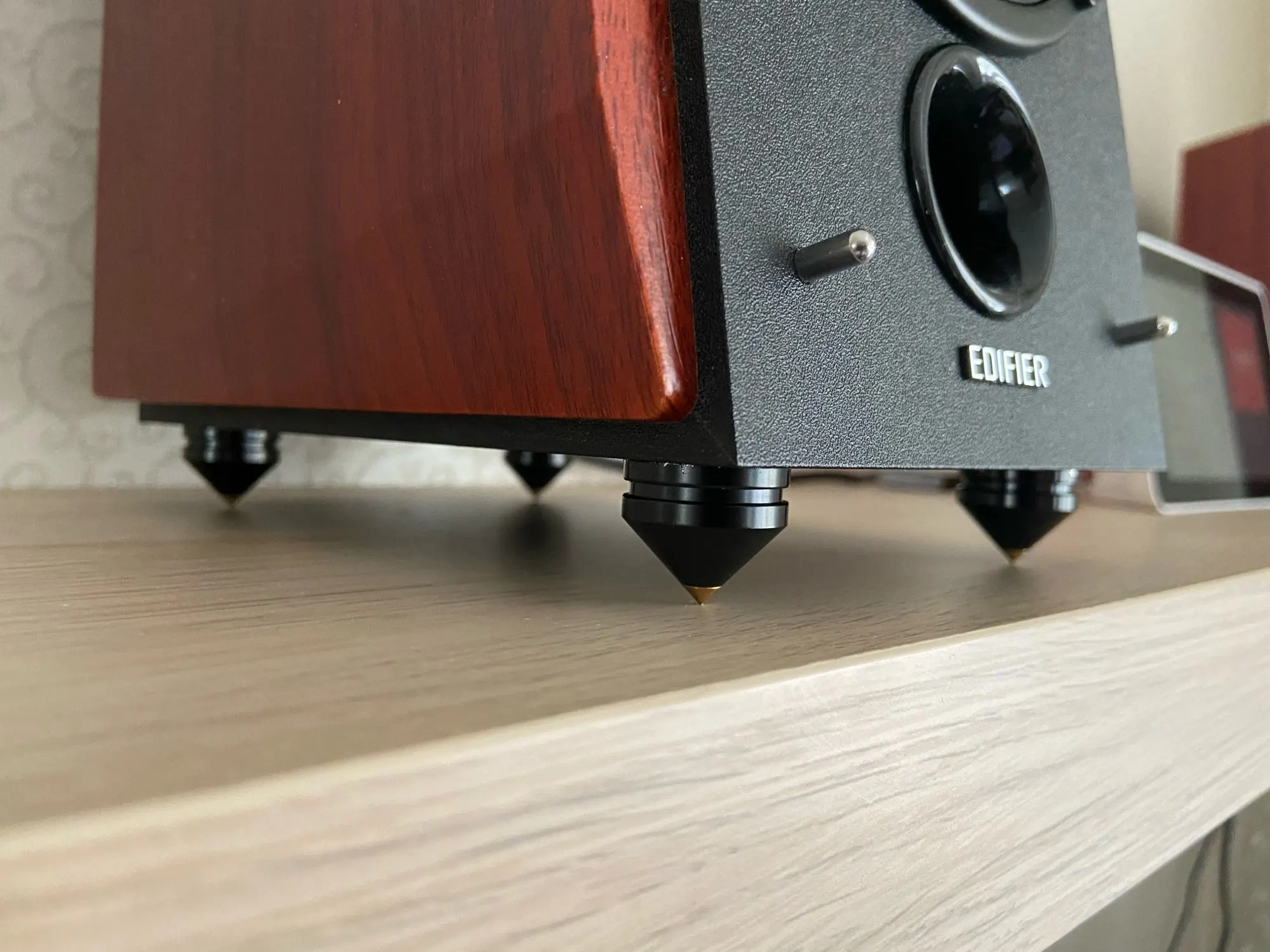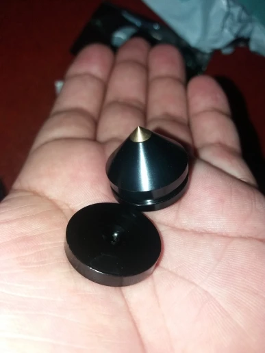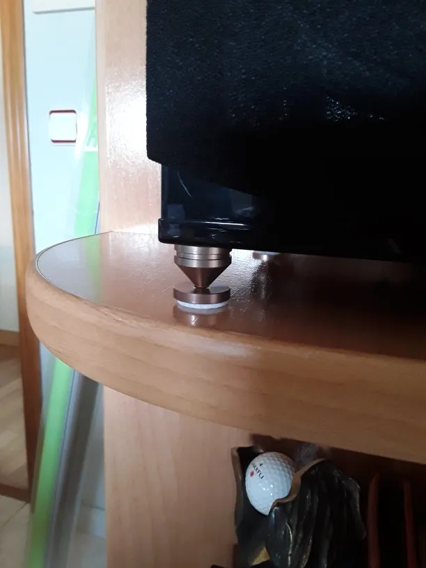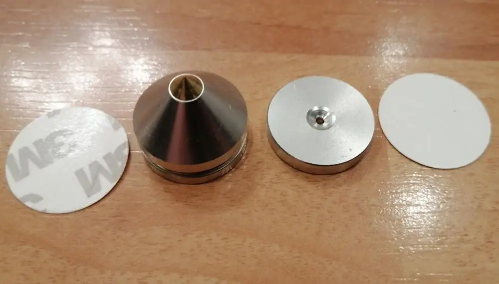 Неоднократно и много лет покупал шипы с шайбами для акустической развязки. По качеству изготовления эти лучше всех. Но в опоре есть сквозное (!) отверстие около 1мм диаметром. Поэтому шип будет опираться не на точку, а на окружность диаметром. Как это повлияет на звук пока не знаю. Проверю, отпишу позднее.