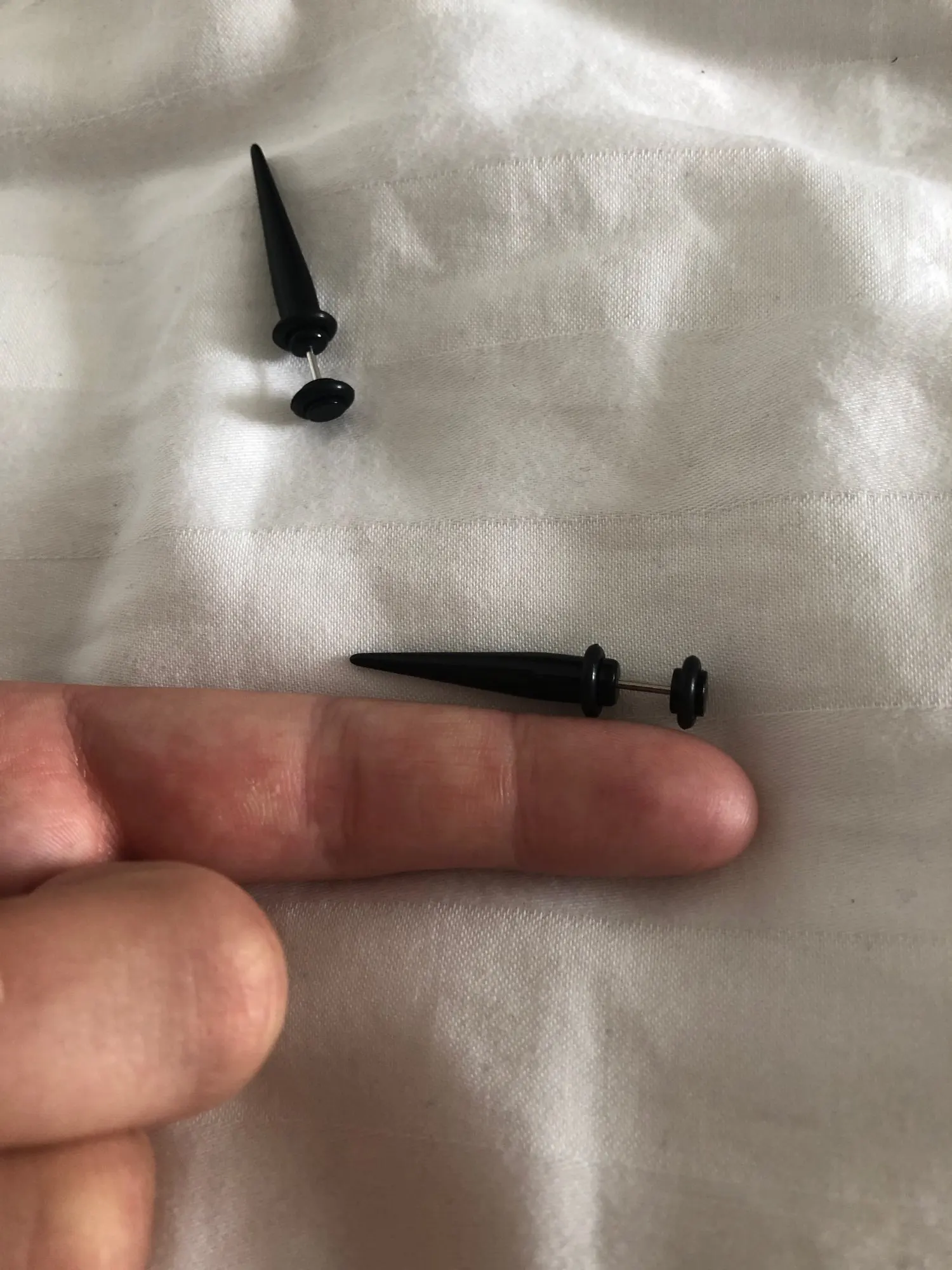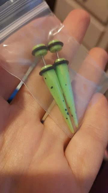 Замечательный товар, все соответствует описанию. Брала самый большой размер в 10 мм. Серьги прошли проверку рабочим днем, носились практически сутки. Сами муляжи лёгкие, уши после них не болят. Не смотря на размер практически не цепляются ни за одежду, ни за маску, а в ушах выглядят как настоящие тоннели. Из минусов: долгая доставка (до Киева ехали месяц, товар не отслеживался по Украине)и слегка толстоват гвоздик, так как входят в уши только с небольшим усилием. В первый раз без посторонней помощи надеть не смогла. Плюс резьба для закрутки находится в разных местах: в одной сережке она находится в "крышечке" и надевается спереди, а во второй наоборот и продевается в ухо она сзади. При попытке дезинфекции(на радостях пшикнула на них спиртовым антисептиком)черная резиночка начала красить руки. После высыхания прекратила. В остальном товаром более чем довольна. Людям, которые хотят посмотреть на себя с тоннелями и произвести шикарный эффект или не хотят тянуть настоящие очень рекомендую!