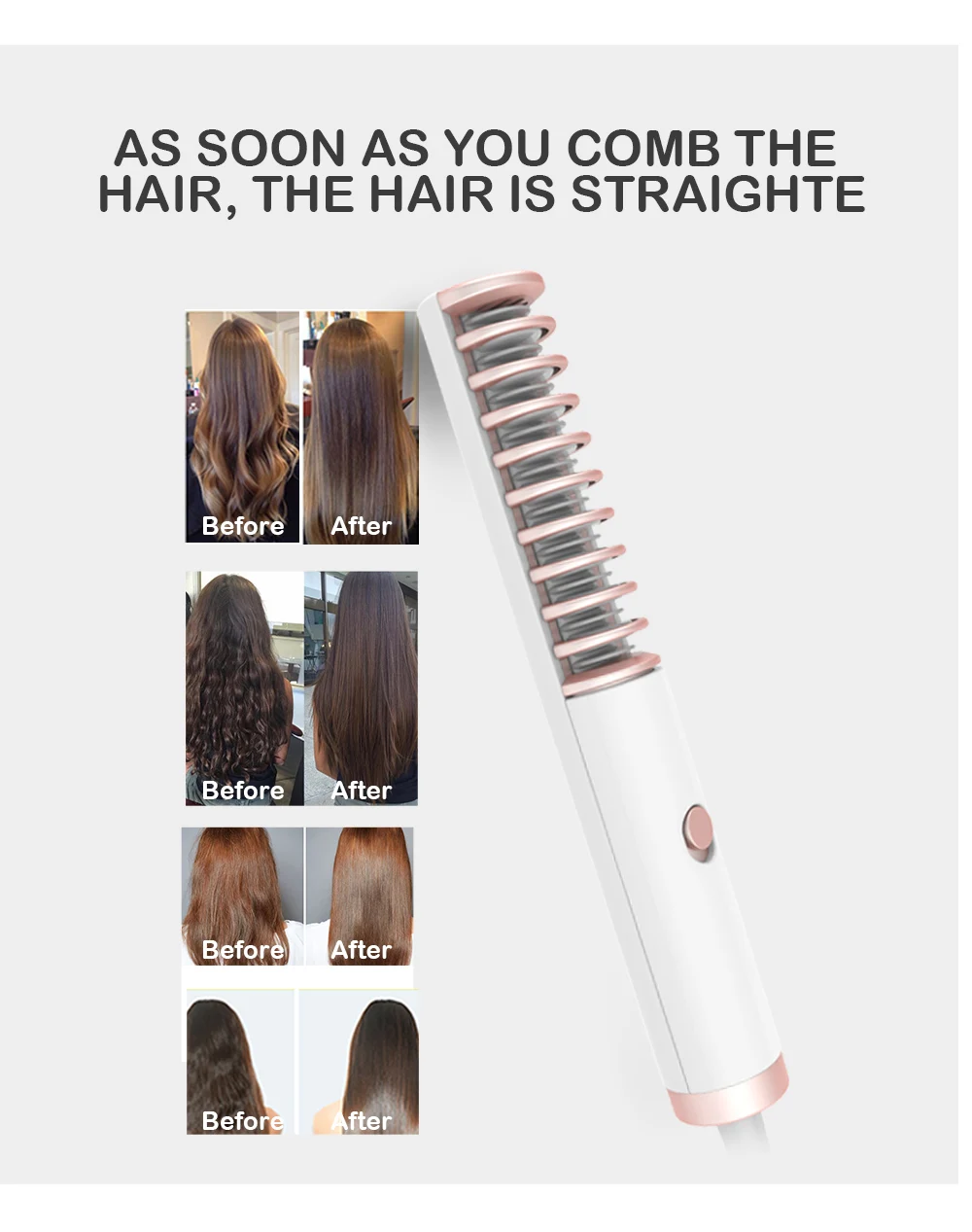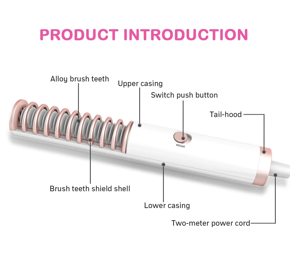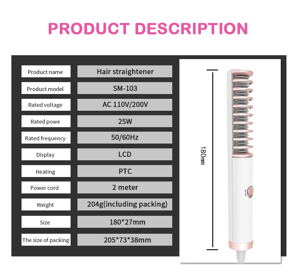 Мини выпрямитель для волос щеткиНоминальное напряжение: AC 110-240 В пер. тока, 50/60 Гц;Мощность: 25 Вт;Мини-Расческа для прямых волос, расческа для бороды;Легкий дизайн, удобно носить с собой, прост в использовании;Размер продукта: 27*180 мм;2 м шнур, штекер может быть настроен в соответствии с dfferent стран;