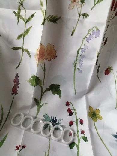 Отлично выглядит шторка. Рисунок нанесён аккуратно. В комплекте колечки ( одно даже запасное). Спасибо продавцу. Мне очень понравилось. На фото не отглажена.