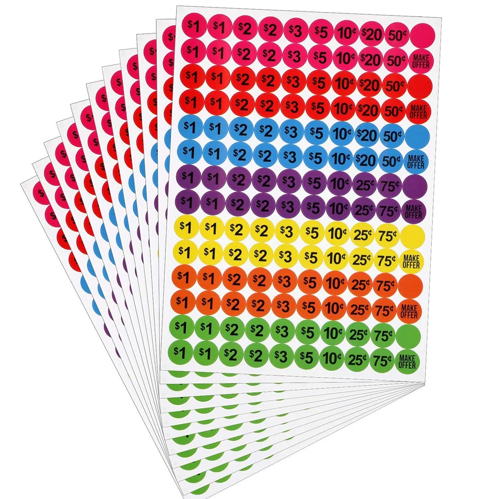 Различные печати: в каждом листе есть несколько штук 1 доллар, 2 доллара, 3 доллара, 5 долларов, 10 центов, 25 центов, 50 центов и 75 центов, несколько пустых наклеек и несколько напечатанных «сделать предложение», которые могут удовлетворить ваши основные потребности, подходят для применения на рынках и в магазинах