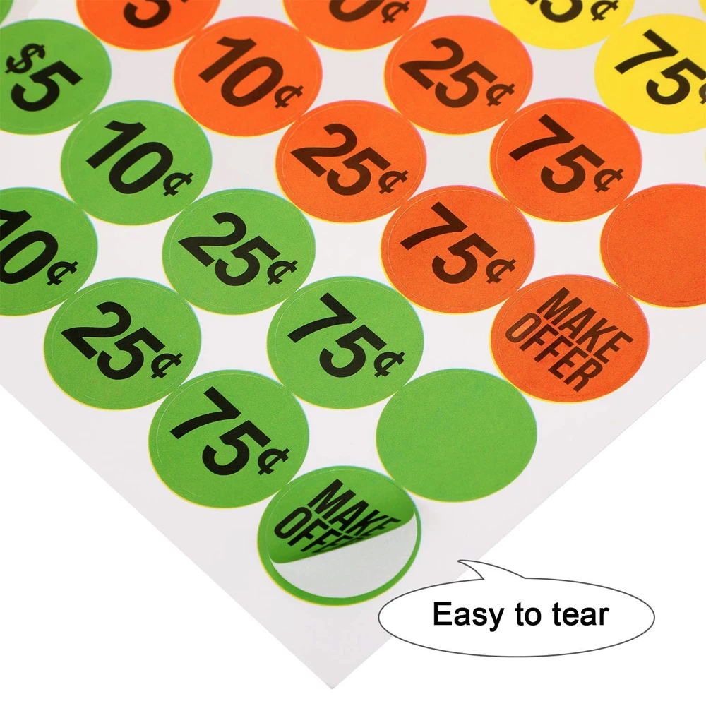 Самоклеящаяся особенность: каждая ценовая этикетка является самоклеющейся, поэтому она очень проста в эксплуатации, просто получите 1 ценовую этикетку из листа, а затем Наклейте Это место, где вы хотите, чтобы он был, этикетки могут быть плотно приклеены к многим поверхностям, таким как одежда, предметы домашнего обихода, инструменты, книги, коробки и так далее