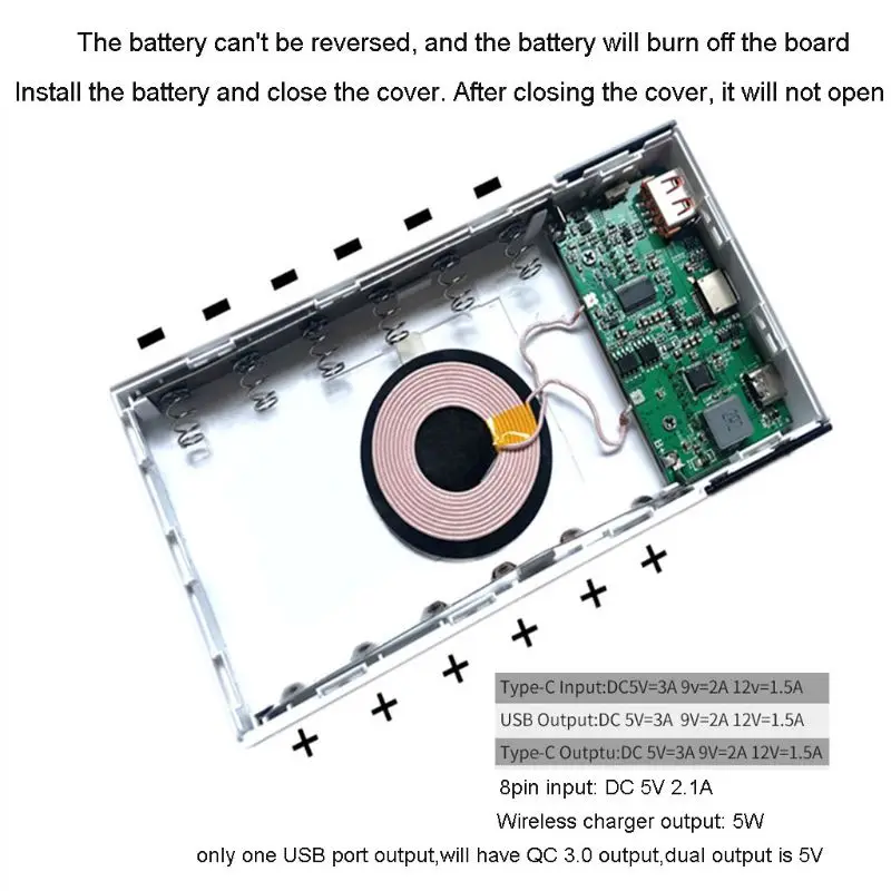 Беспроводное зарядное устройство Qi 6X18650 для быстрой зарядки QC3.0 USB Type C PD