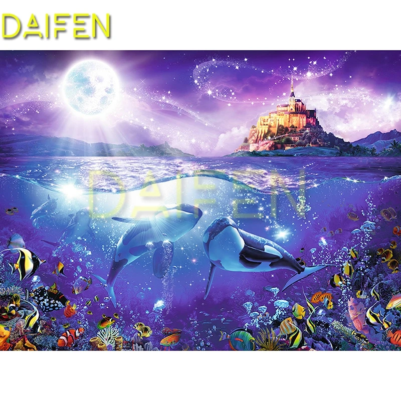 Полноразмерная картина из искусственных страз, замок, дельфин, луна, полная круглая картина из страз, вышивка крестиком, замок, море, сделай сам, 3D Алмазная мозаика