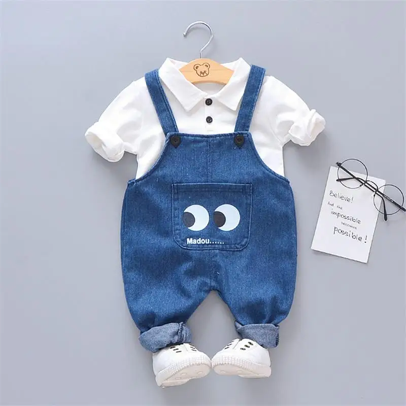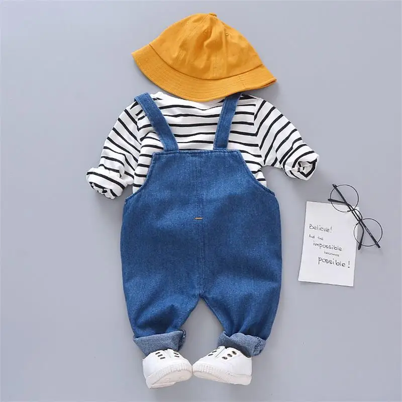 2022 Весенний костюм для маленьких девочек и мальчиков, Детская Повседневная футболка с длинным рукавом + джинсовый комбинезон, комплект одежды для новорожденных, одежда для малышей