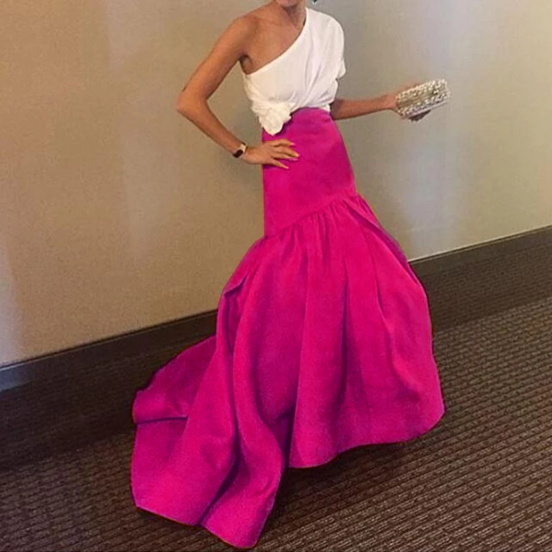 Женская атласная юбка-годе, длинная многоярусная юбка цвета фуксии со шлейфом, по индивидуальному заказу, размера плюс