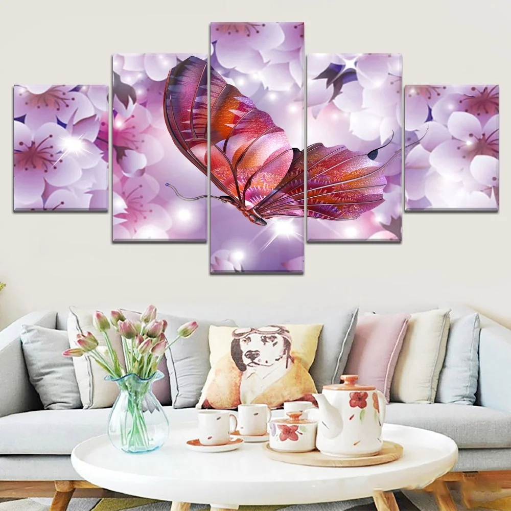 Картина на холсте, 5 панелей, фиолетовые цветы, бабочки, пейзаж, на...