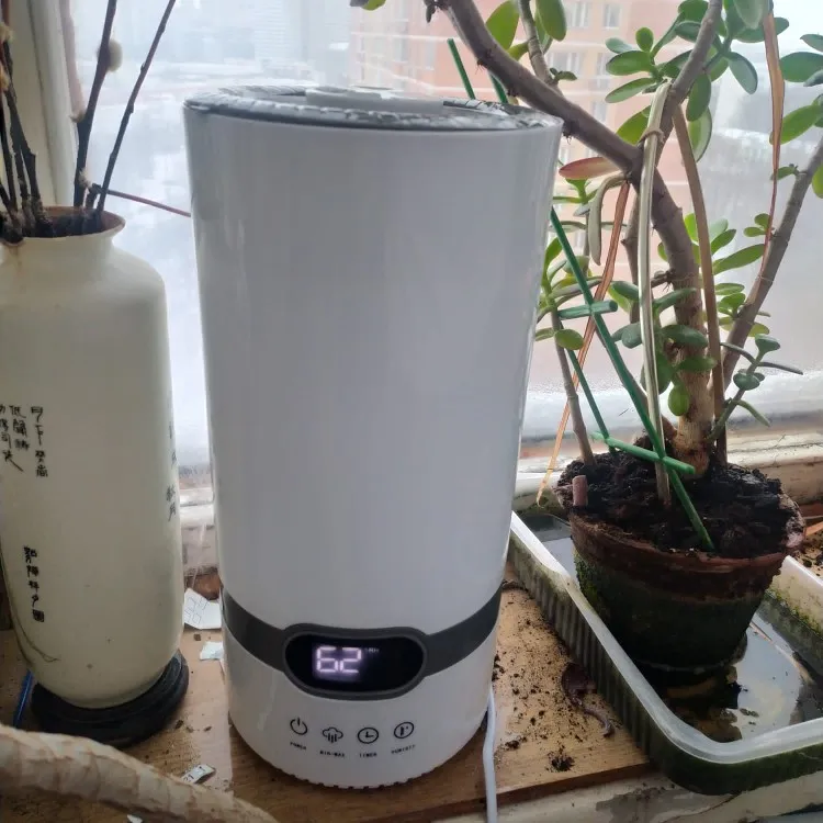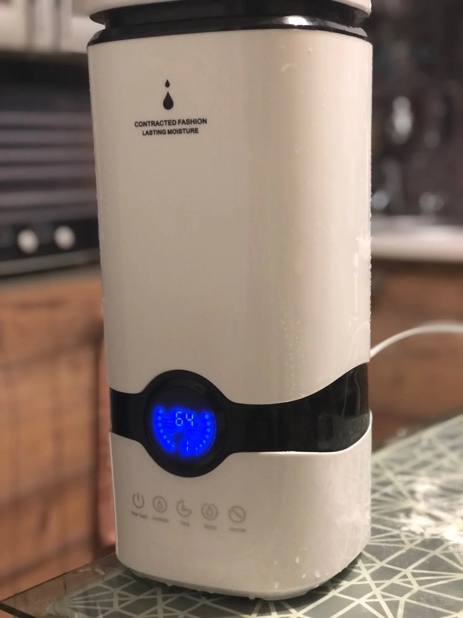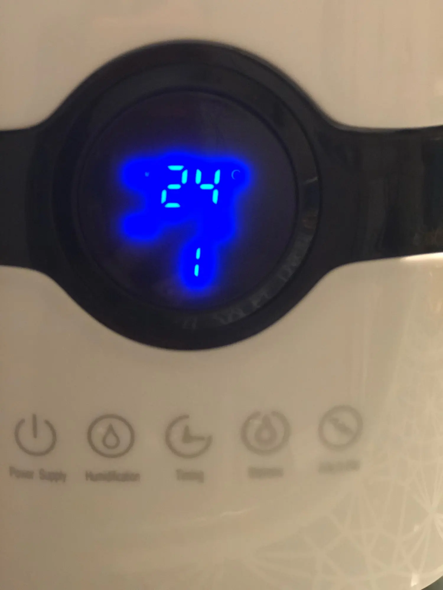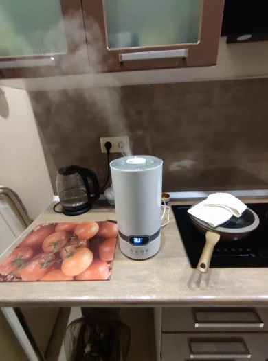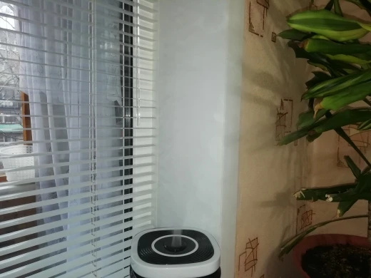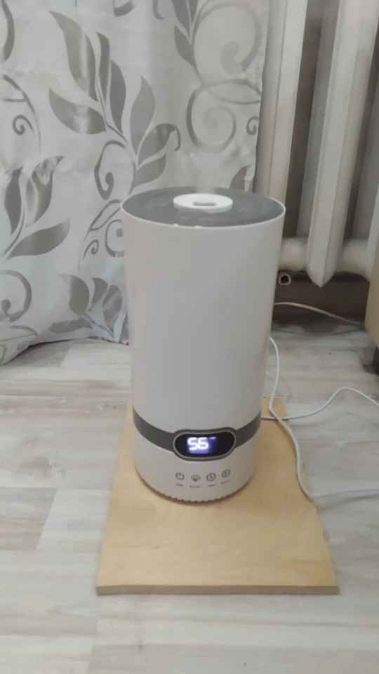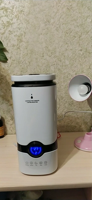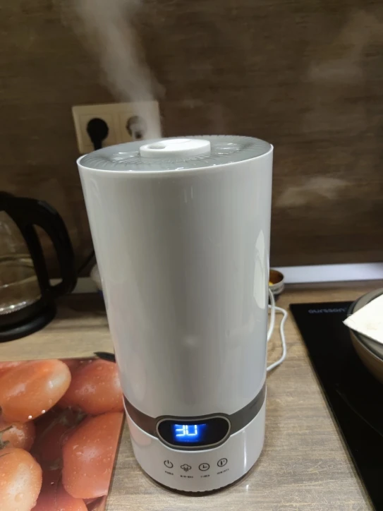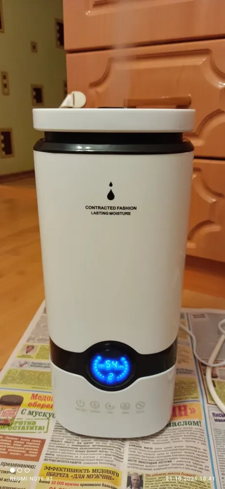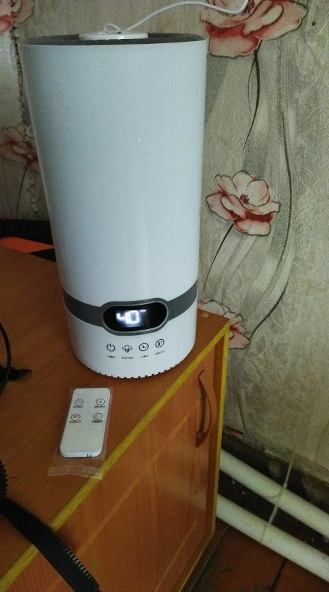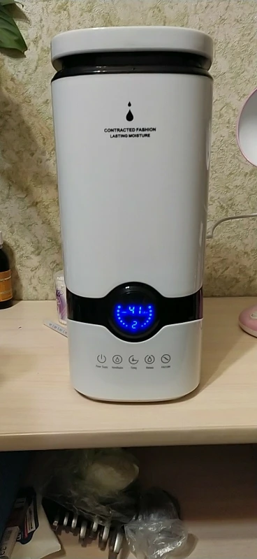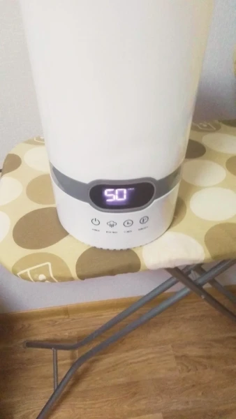 Это мой первый увлажнитель воздуха, поэтому не с чем сравнивать. Показывает влажность воздуха, но за ночь процент увлажнения поднимается всего с 30 до 31-32. Я не знаю, достаточно ли это. Воды на мебели нигде нет.