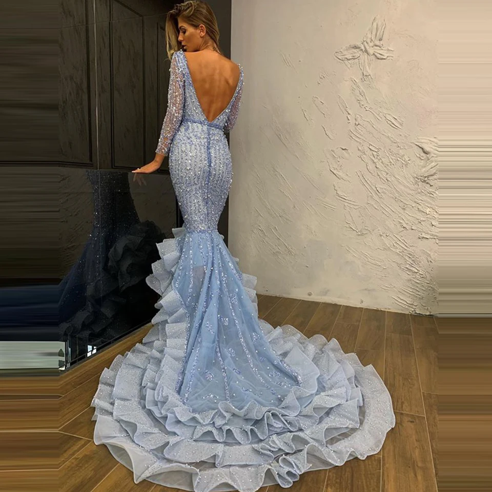 Роскошные выпускные платья, прозрачные женские платья с длинными рукавами, стразами и оборками, с низкой спиной и шлейфом, женская одежда для торжества