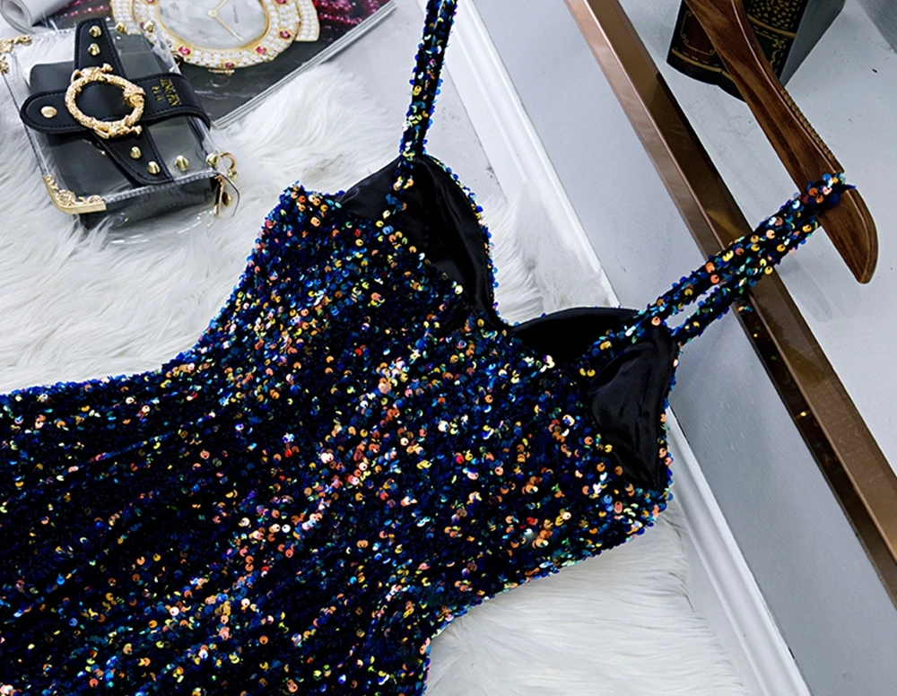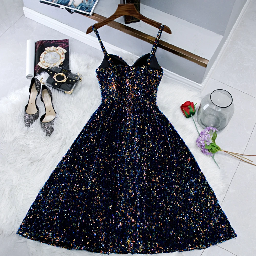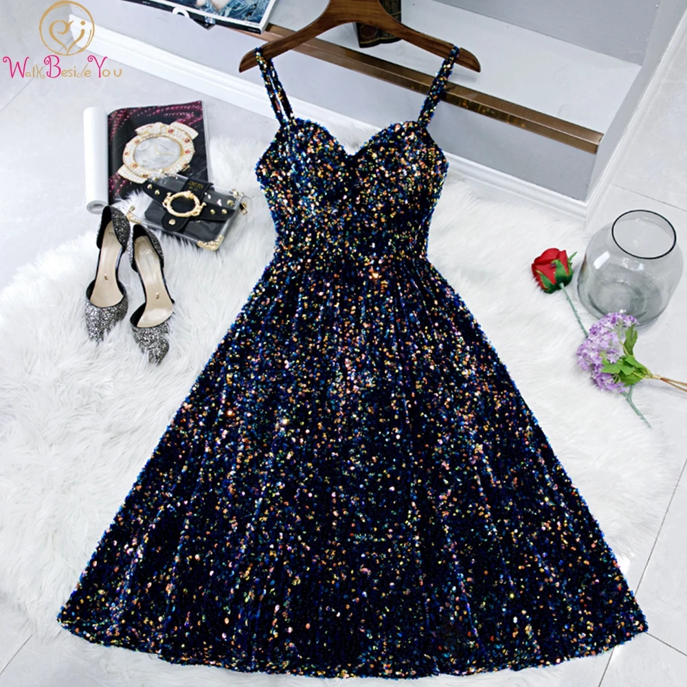 Коктейльные платья до колена, темно-синие на тонких бретелях, с блестками, с вырезом сердечком, 2021