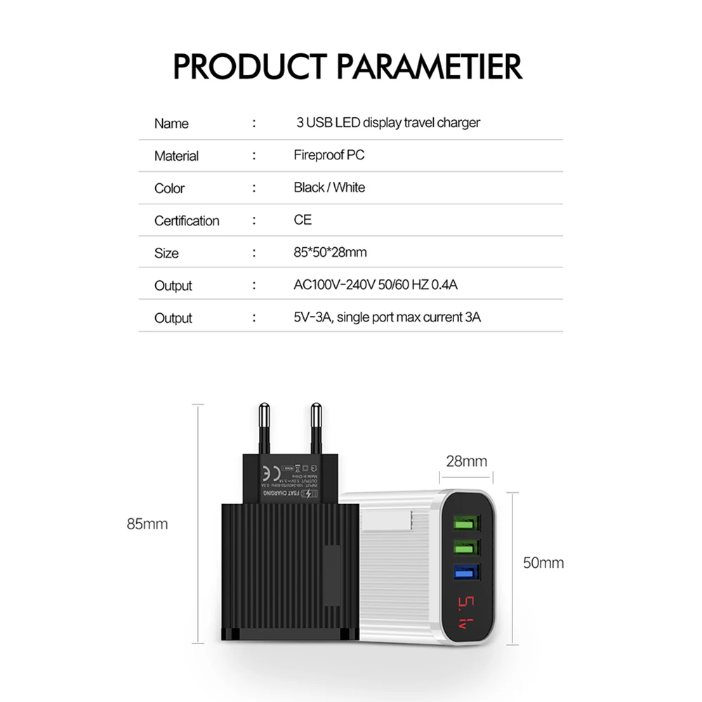 Зарядное устройство с 3 USB-портами и цифровым дисплеем, 5 В, 3 А