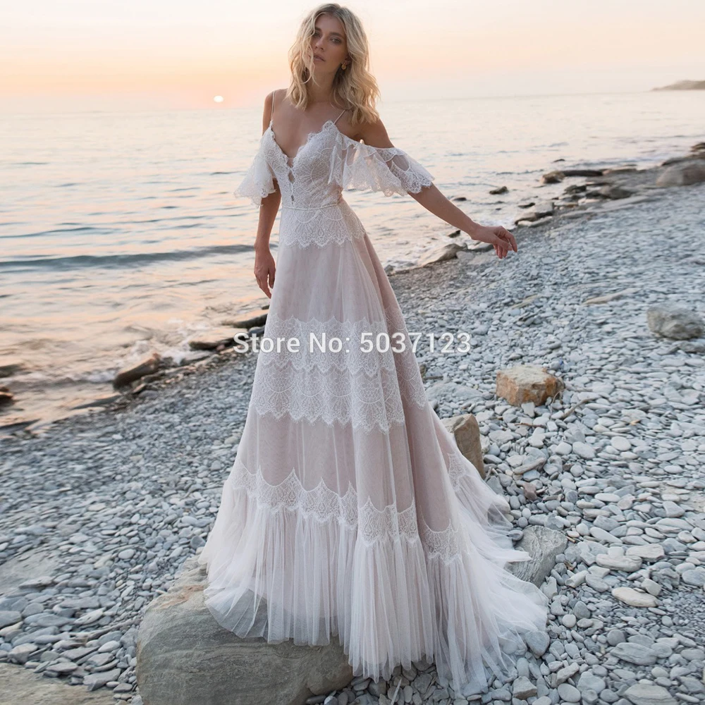 2021 богемное свадебное платье соблазнительное телесное шампанское с V-образным вырезом шикарные рукава бретельки оборки кружева ТРАПЕЦИЕВИДНОЕ Свадебные платья с глубоким вырезом на спине
