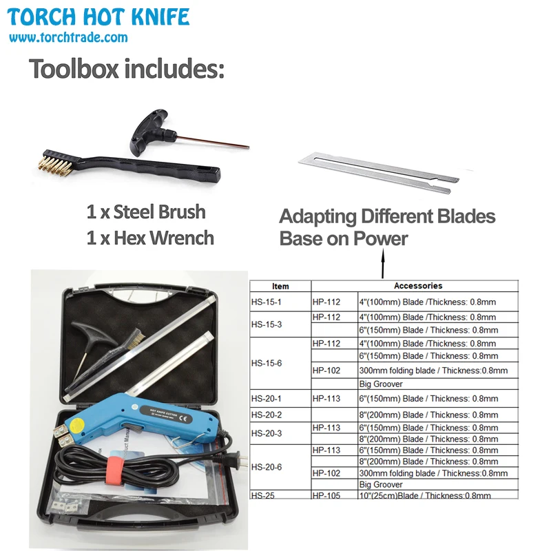 1 х 200 Вт Горячий Нож 1x200 мм (8 ”) лезвие 1 х Кисть 1 x ключ, дюймовый стандарт Инструкция (1 шт.) 1 x набор инструментов (Распределите адаптер в соответствии с вашей страной)