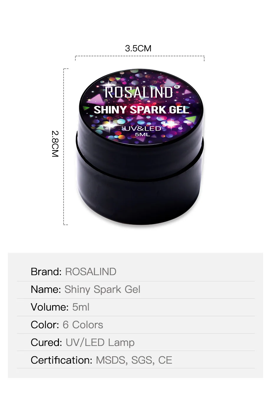 Характеристики Товара:Название бренда: ROSALINDНазвание: блестящий Искрящийся гельОбъем: 5 млЦвет: 6 цветовИзлеченная: УФ/Светодиодная лампа-Качество-наш первый приоритет.-Светильник, почти без запаха (только верхнее покрытие и основа имеют умеренный запах), мы применяем только органическую текстуру для защиты вашего здоровья.-Цвет будет сиять до 30 дней.-Цвета на выбор, подходят для всех случаев.Шаг за шагом:-1. Форма ногтя. Слегка смочите поверхность ногтевой пластины. Дезинфицировать.-2. Нанесите базовый слой основы от кутикулы до свободного края (не забудьте запечатать край ногтя). Высушите ногти под светодиодный светильник в течение 10 секунд или УФ-светильник в течение 2 минут.-3. Нанесите тонкое пальто отмачиваемого геля на выбор. Свободный край крышки. Лечение: 30 секунд в светодиодный светильник, или 2 минуты в УФ-лампе.-4. Повторите 2-е тонкое покрытие отмачиваемого гель-лака на ногти. Высушите под светодиодный лампой в течение 30 секунд или УФ-светильник в течение 2 минут.-5. Нанесите верхнее пальто. Свободный край крышки. Лечение: 30 секунд в светодиодный светильник.-6. Удалите липкий остаток на ногтях с помощью очищающего средства. Затем нанесите питающее масло кутикулы для увлажнения влаги в кутикулу и кожу вокруг ногтя.Для удаления:-1. Отмачивайте ногти в акриловом удалителе в течение 5 минут.-2. Аккуратно Наденьте на каждый ноготь всю эмаль для ногтей.Внимание:1. Объем составляет 5 мл. Поскольку емкость бутылки составляет более 5 мл, гель для ногтей не будет полностью заполнен бутылкой!2. Плотно закрываются. Держите подальше от солнечного света. Хранить в недоступном для детей месте.