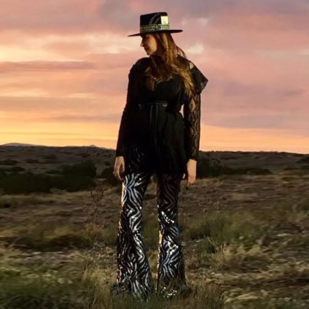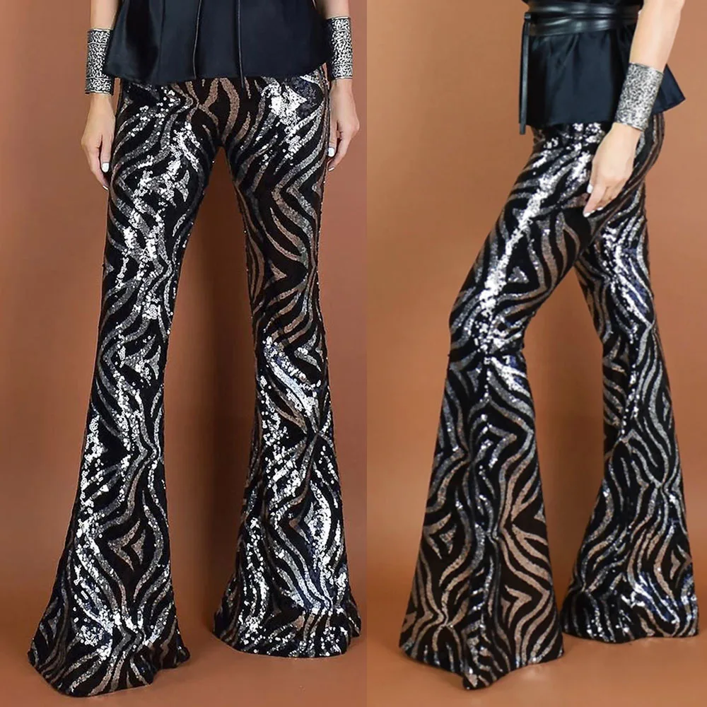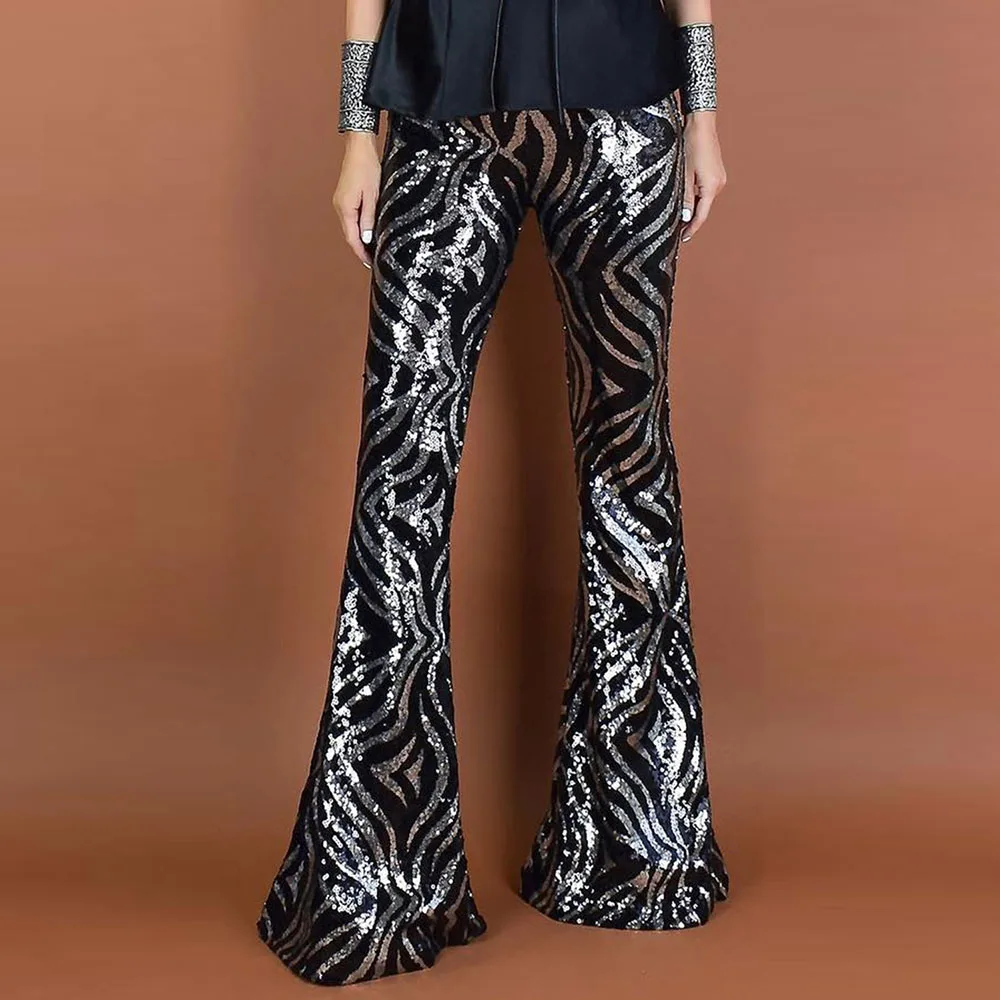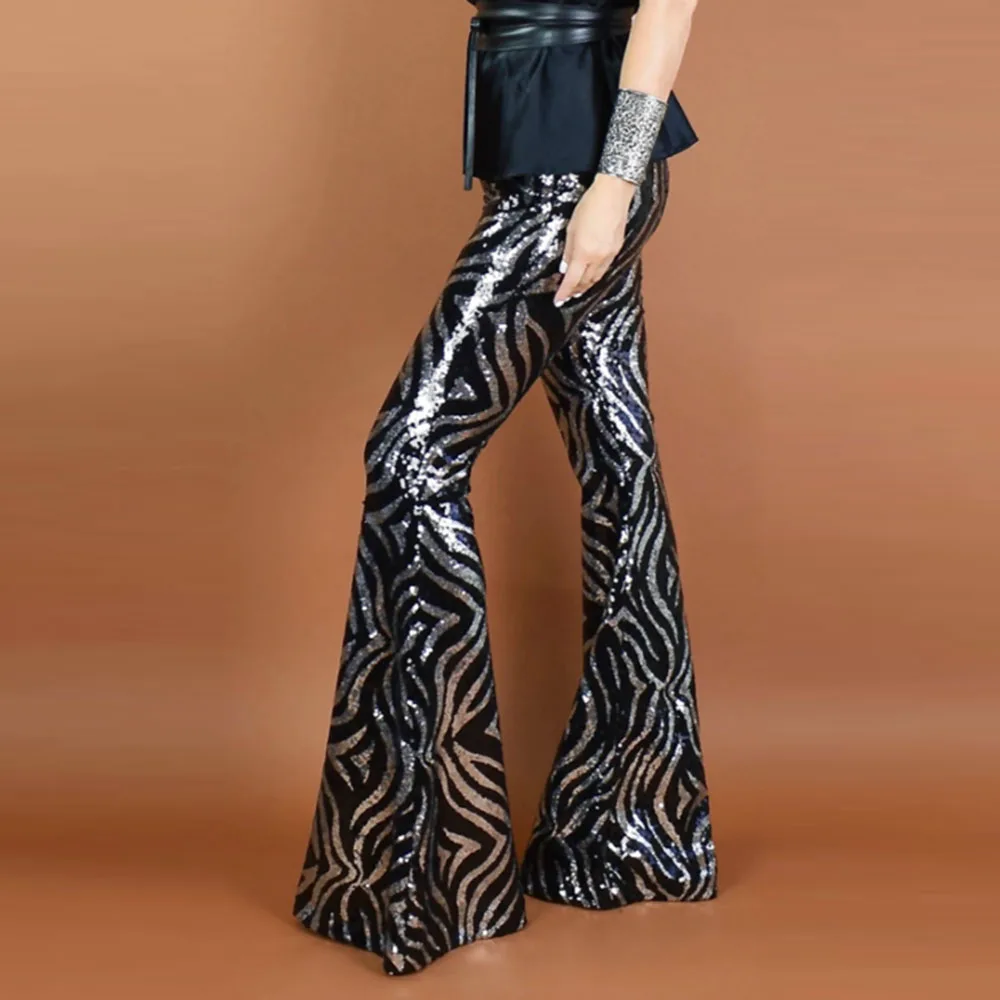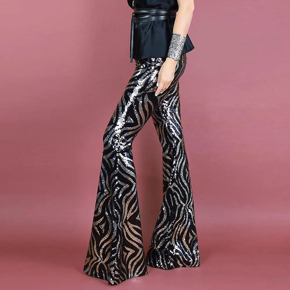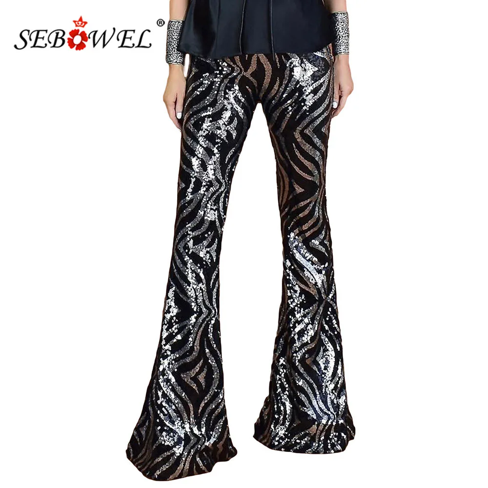 Женские брюки с высокой талией SEBOWEL, черные, серебристые Вечерние брюки с блестящими волнистыми узорами для танцев, эластичные брюки с расклешенным низом