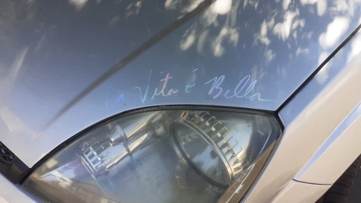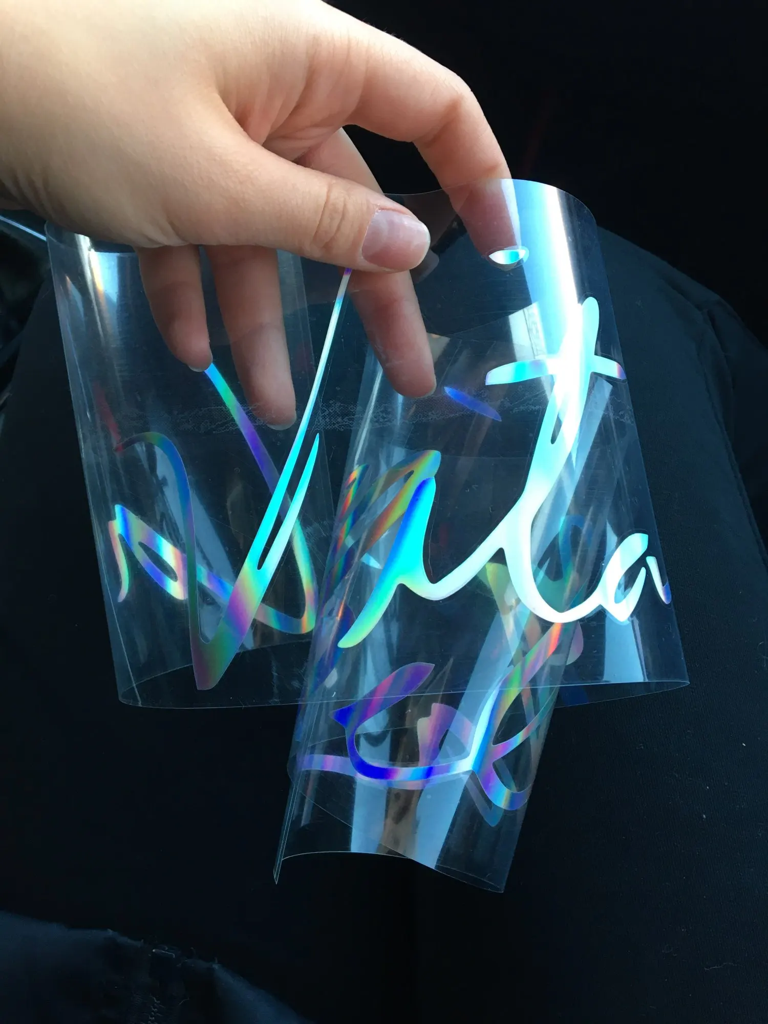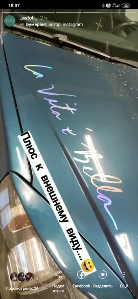 дуже гарна наліпка. в пасмурну погоду просто сіра. але якщо виходить сонечко - переливається всіма кольорами веселки.