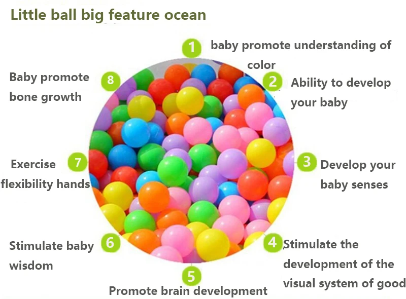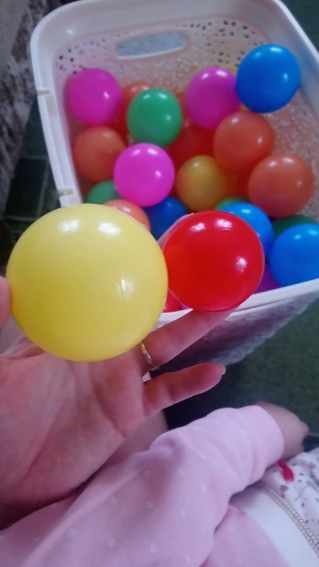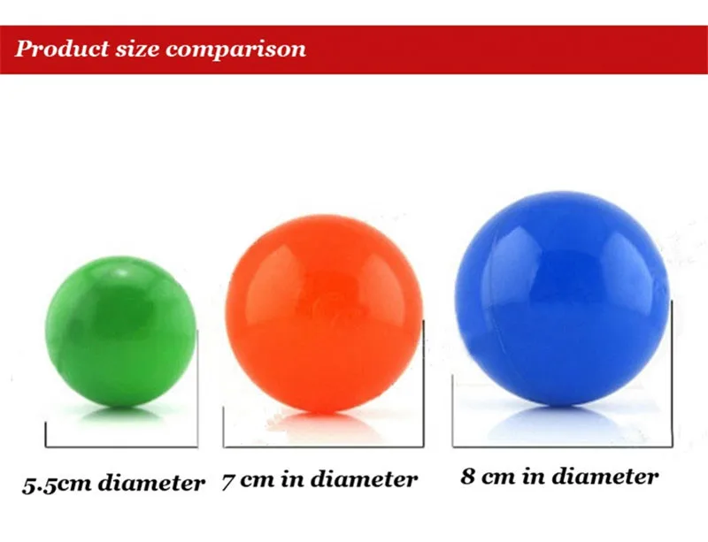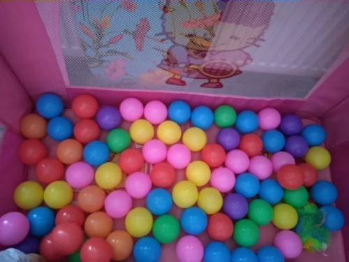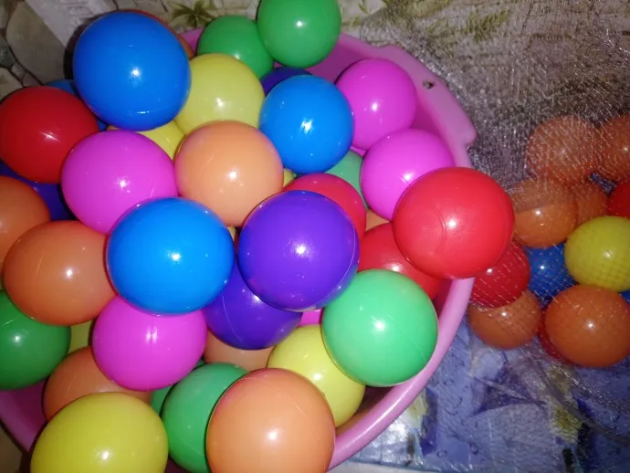 пришли шарики быстро, две сетки в почтовом пакете, умотанные скотчем. Цвета яркие, 7, как и заявлено, диаметр 8 см, но меньше российских 8 см). на боку клеймо-китай и знаки какие-то. мягкие, упругие, яркие, но в бассейн их надо больше -2 упаковки, всё ещё мало, закажем снова, рекомендую