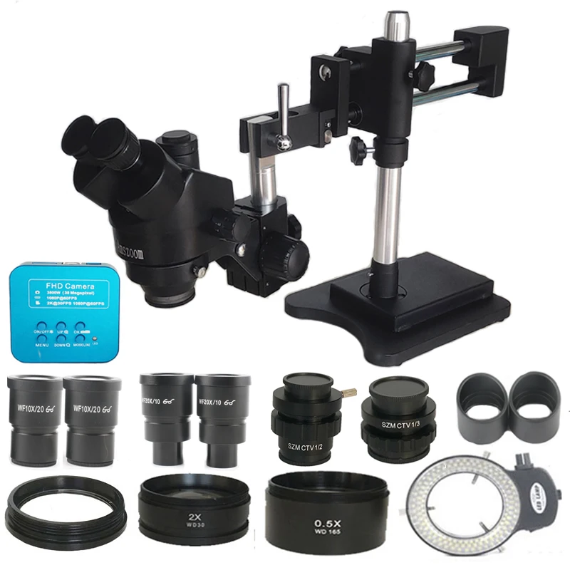 1 тринокулярная Стерео Зум-головка1X пара супер Widefield окуляра высокой точки WF10X окуляры1X 0.5X вспомогательная цель WD 165 мм1 x2.0x вспомогательная цель WD 30 мм1X защитное стекло1 двойная стойка1х стойка для фокусировки1 пара защитных очков1X144PCS светодиодный светильник