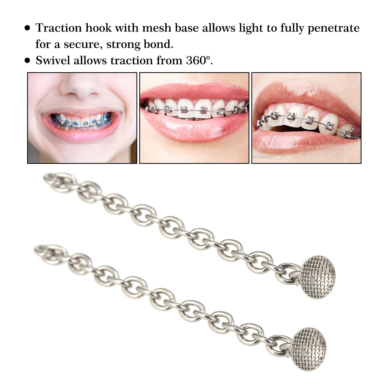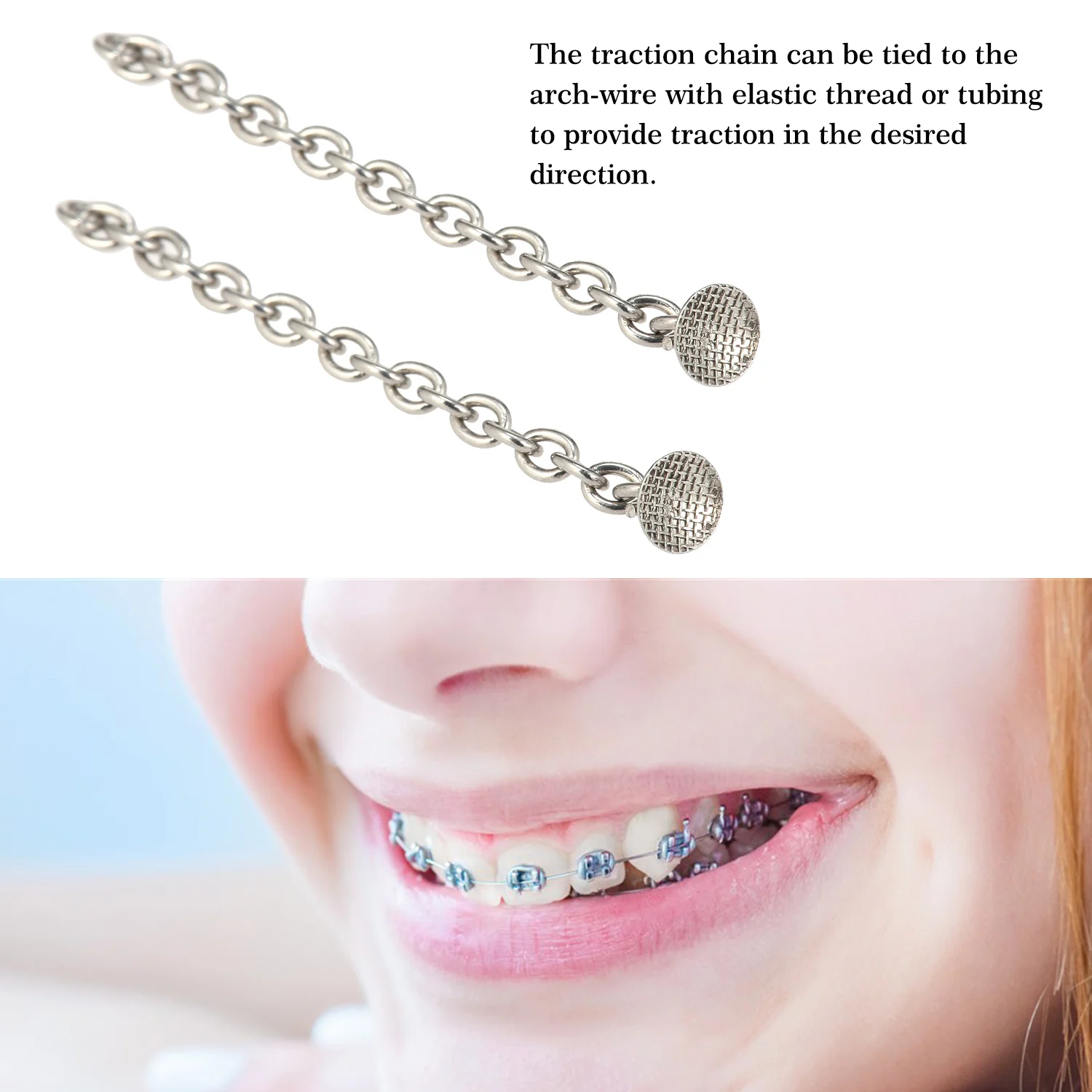 Тяговую цепь можно привязать к арочной проволоке с помощью эластичной нити или трубки для обеспечения тяги в желаемом направлении.
