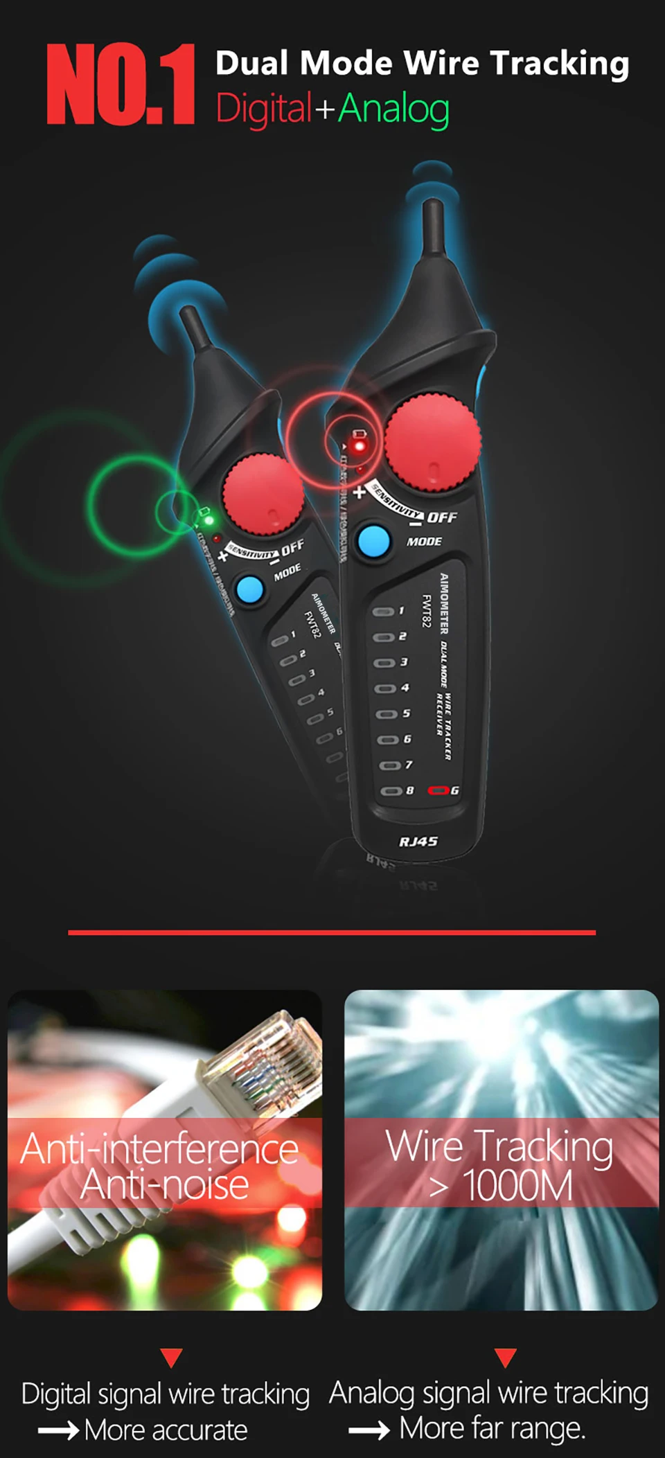 -В цифровом режиме нет шума при отслеживании проводов, более точное и Быстрое позиционирование оконечного сетевого кабеля. -В аналоговом режиме расстояние отслеживания составляет более 1000 метров. -Поддержка отслеживания электрической проволоки (до 60 в).