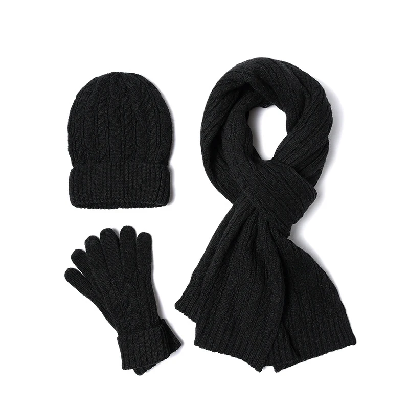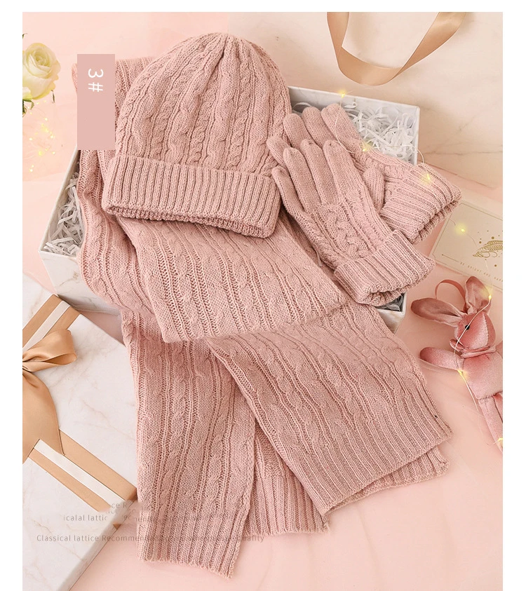 Шапка, шарф, перчатки, вязаный комплект для женщин, зимний теплый шерстяной шапка, однотонная повязка на голову, вязаный шарф, подарок на Новый год, 3 шт.