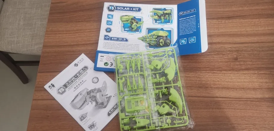 Хороший набор! Подробная и понятная инструкция. Собирал ребёнок, я помогал убирать облой. Заказывал без коробки, т.к. упаковка пакет и пупырка могут повредиться "колеса". На одном из зубчатых колес было повреждение защелки, подклеил и все отлично. Проверить работу солнечной батареи можно лампой накаливания! Рекомендую, ребёнок будет доволен! Собирала дочь, понравился "динозавр")) Фото немного позже!