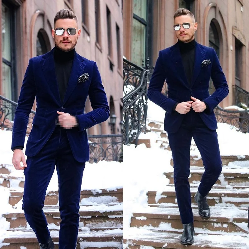 Темно-синий бархатный мужской смокинг на одной пуговице для выпускного вечера подходит для лацканов с надрезом, Мужской Двойной блейзер (пиджак + брюки)