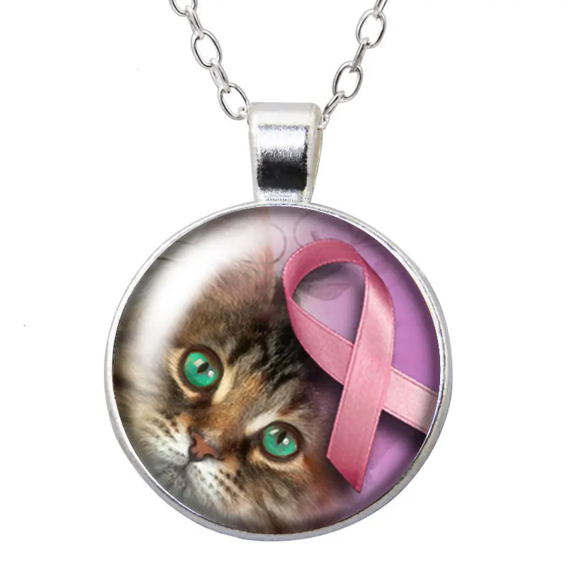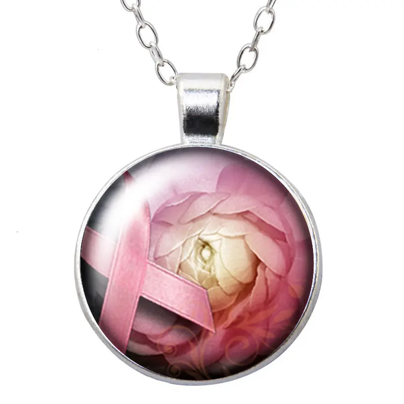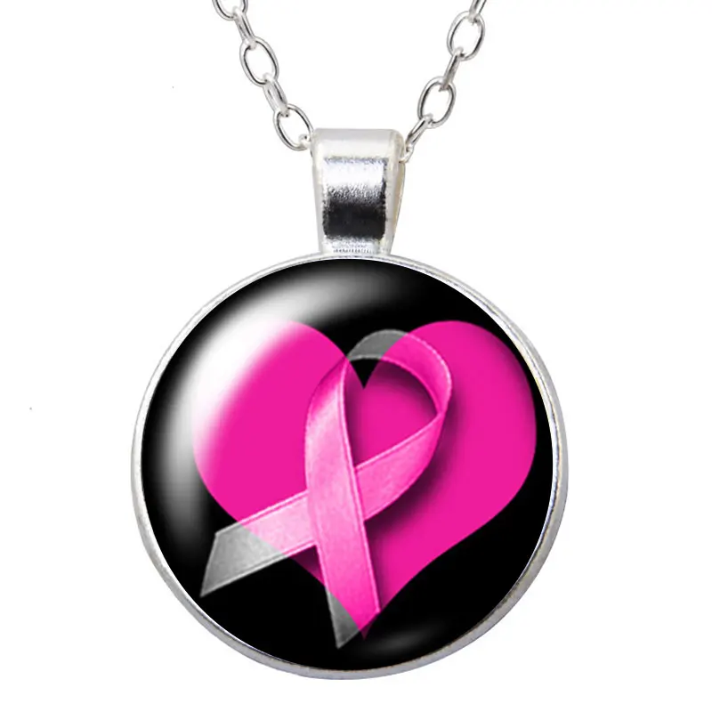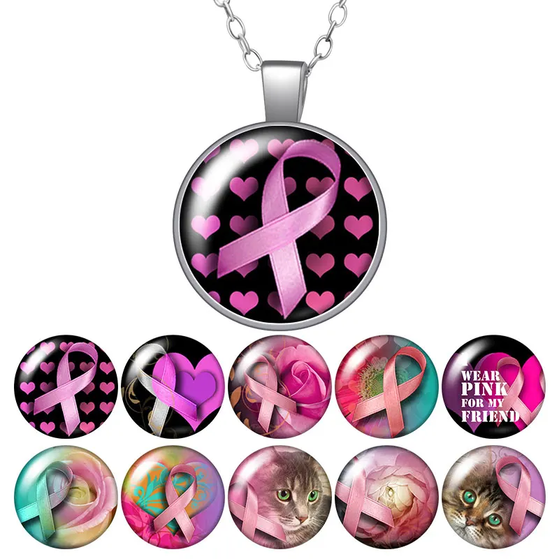 Розовая Лента профилактика рака молочной железы, ожерелье с круглой подвеской с фокусным расстоянием 25 мм кабошоны разрисованные изделия из стекла серебристого цвета с украшением в виде кристаллов Ювелирные изделия из жемчуга для женщин подарок 50 см