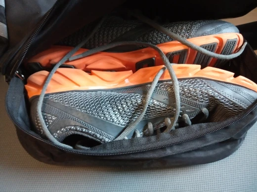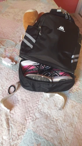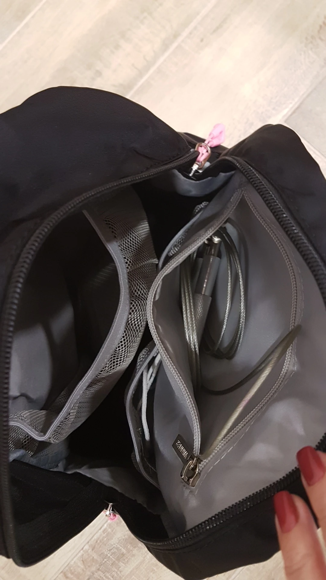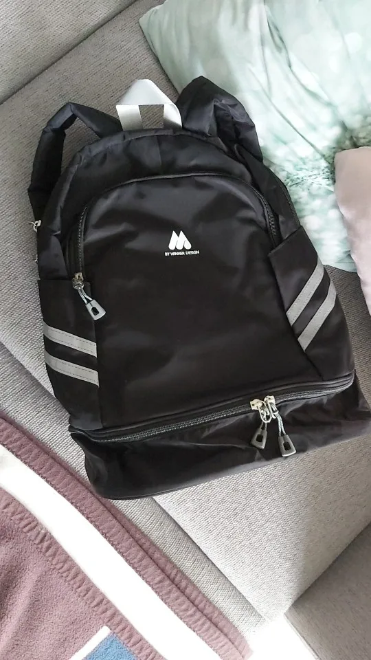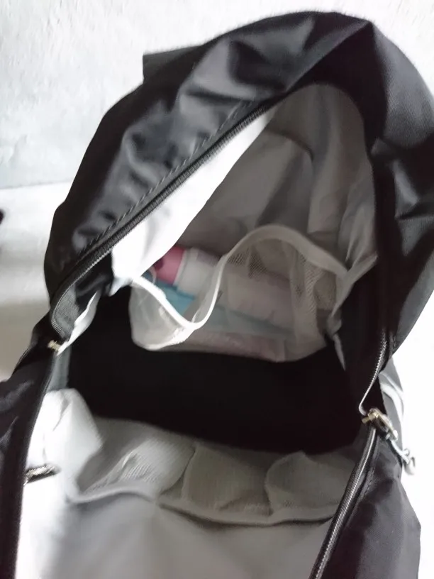 Пришёл очень быстро. Два отделения. Первое - для мокрых вещей, внутри клеенка. Основное отделение с кучей кармашков. Есть карман на молнии на спинке. Ну и вишенка на торте - отделение для обуви. Думала, мои кроссы 41 размера не войдут, но всё поместилось и застегнулось. Смущает только место, где вшиты лямки - с учётом достаточно тонкого материала, надеюсь, что не вырвутся с мясом.