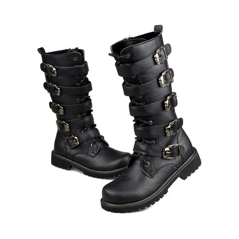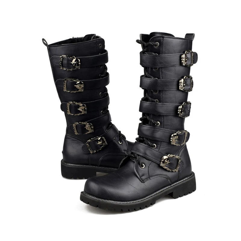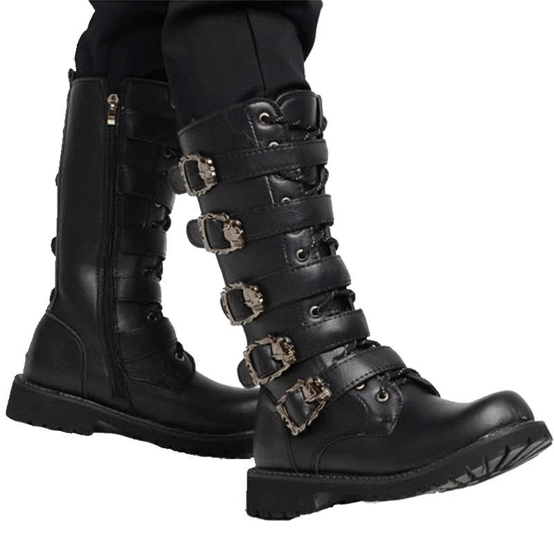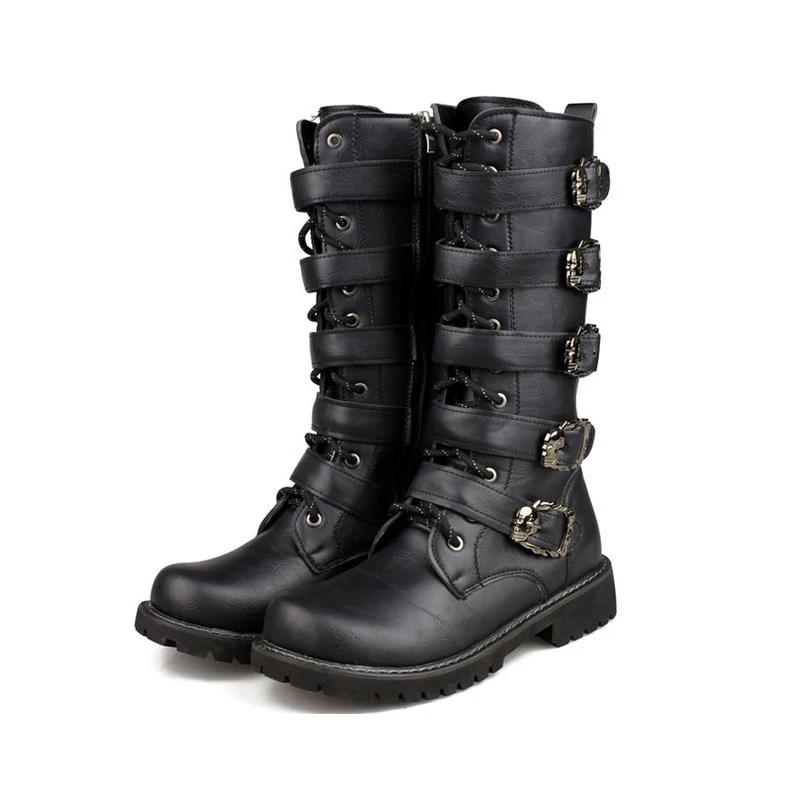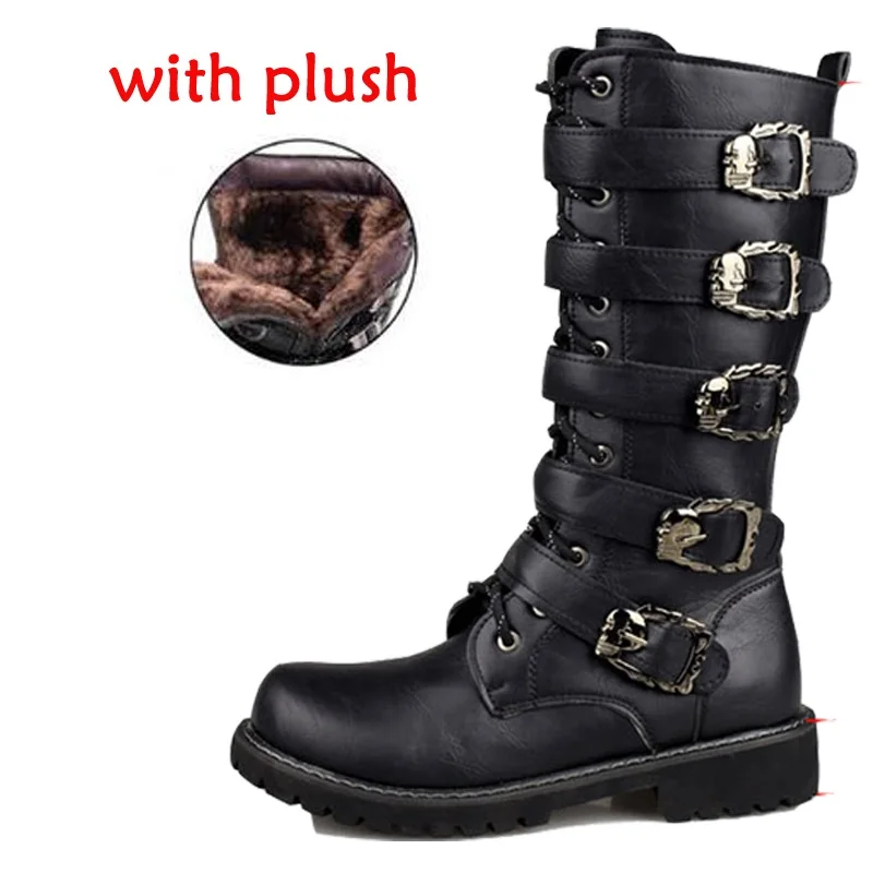 Мужские кожаные мотоциклетные ботинки, ботинки до середины икры в стиле милитари, с ремешком в готическом стиле, с черепом, в стиле панк, тактические армейские ботинки, теплые 46