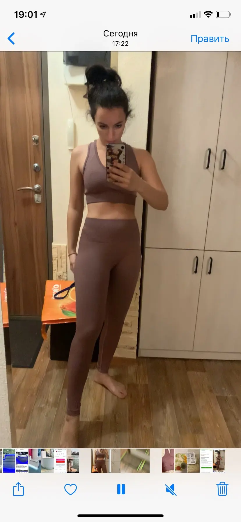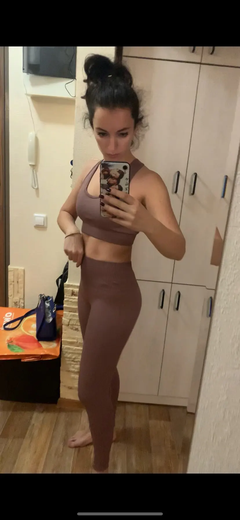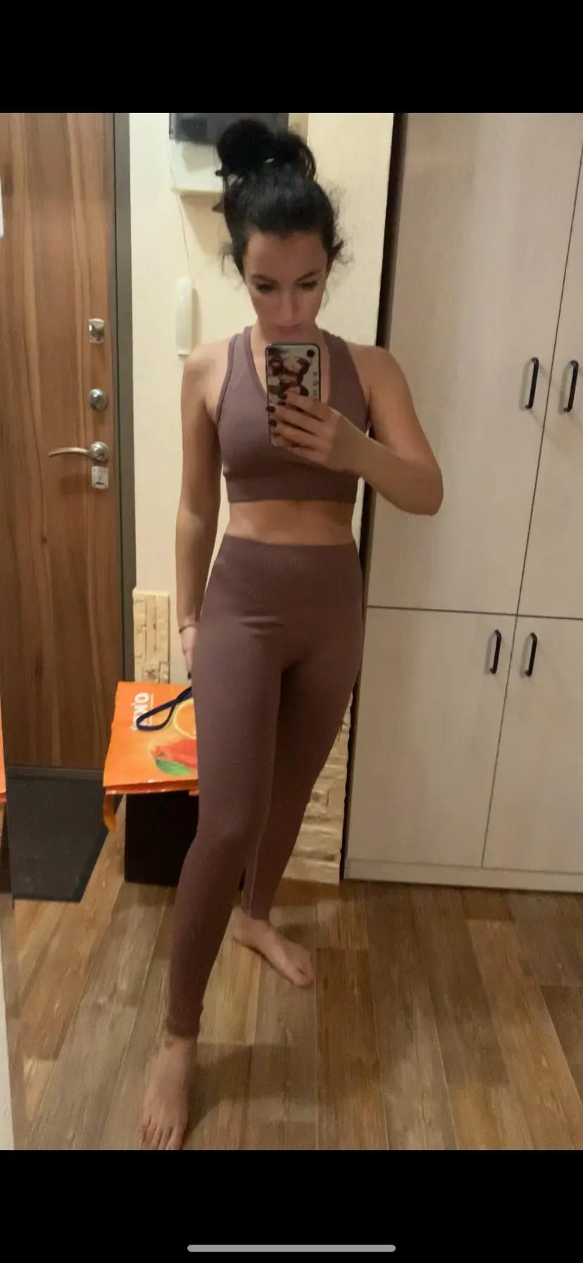 Заказывала 11.11, получила 22.11 на кассе пятерочки, Екатеринбург! Не помню, когда последний раз заказы с али приходили так быстро, тем более с 11.11. Костюм очень понравился - почти бесшовный, эластичный, ткань приятная и плотная, сидит на теле хорошо, ниток и дырок нет. Топ держит грудь, есть вставки. Штаны ровно до талии, немного собираются в коленках, но я коротышка, на девочках повыше будет хорошо. У меня цвет brown, он совсем не brown, скорее розово-фиолетовый. Мой рост 161, параметры 88-69-93