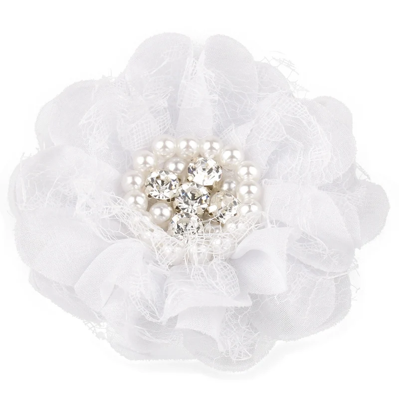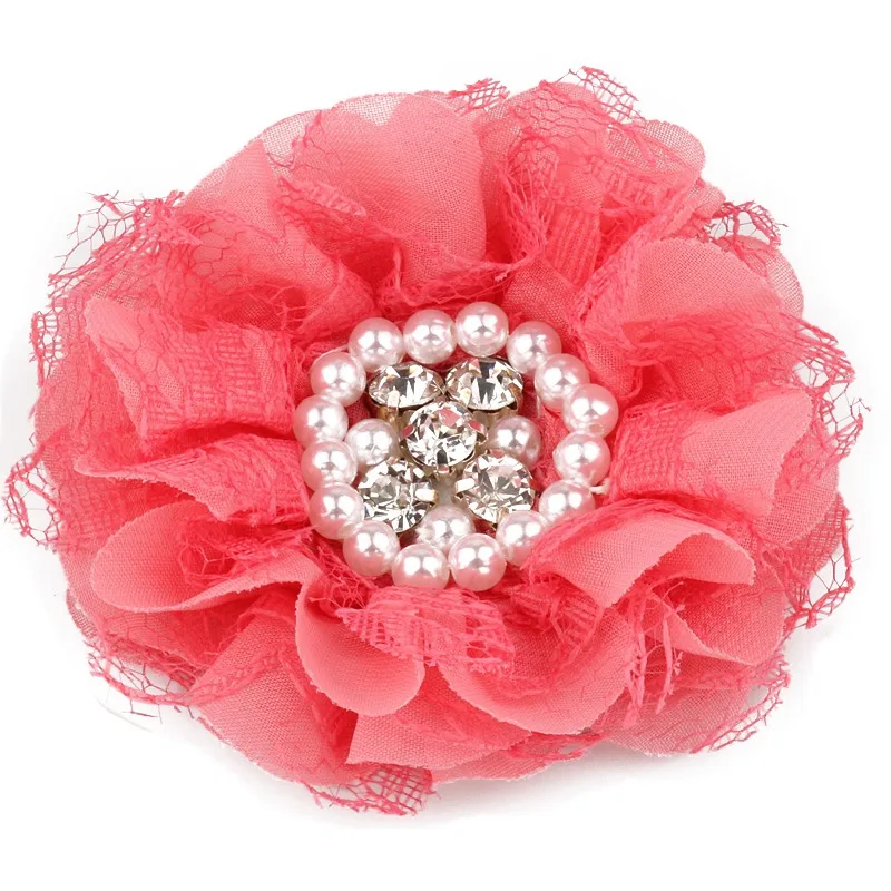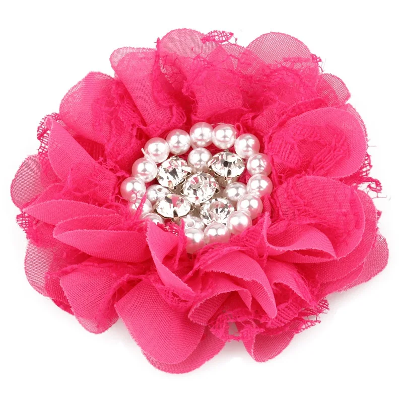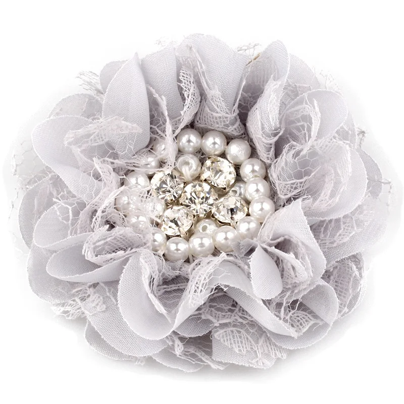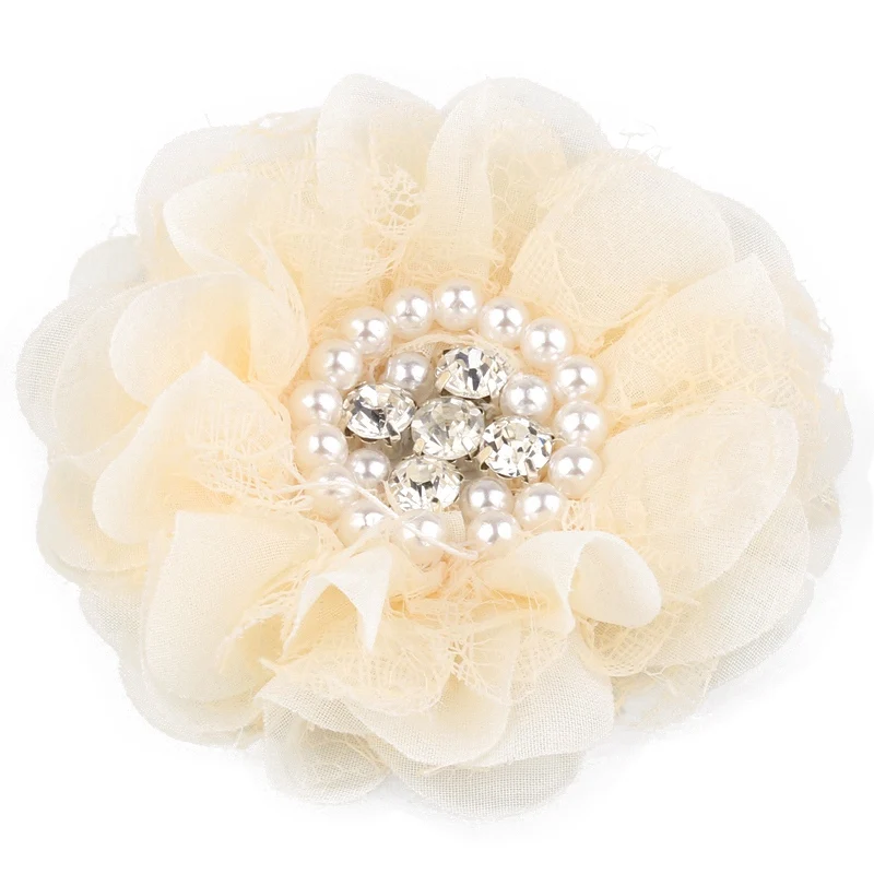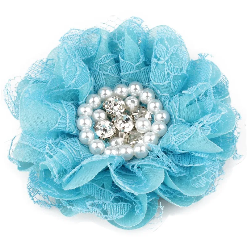 4 шт. 9 см шифоновый кружевной цветок с жемчугом Стразы центр для аксессуаров для волос розетка потертая ткань цветок без зажима