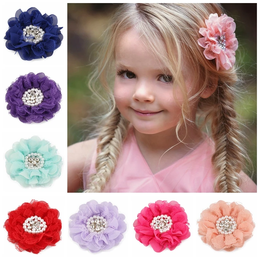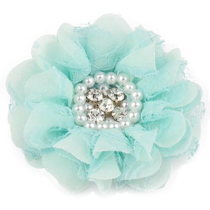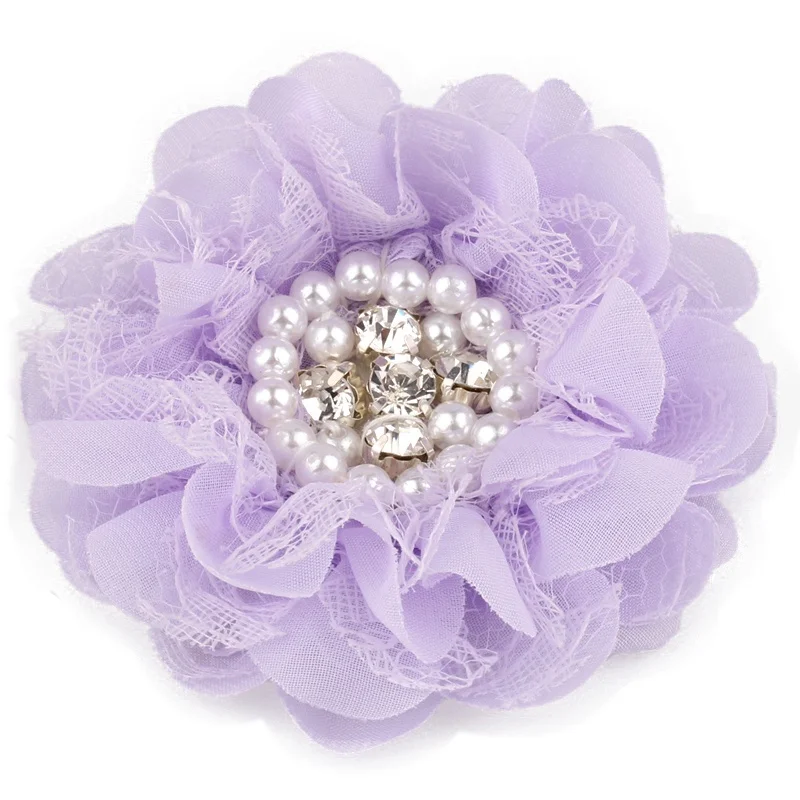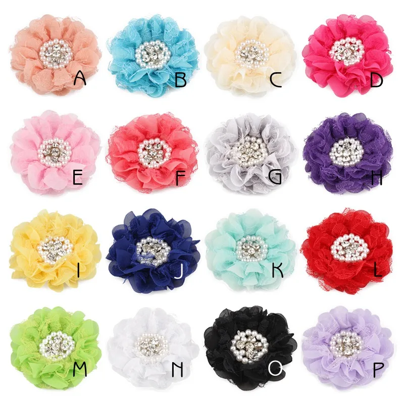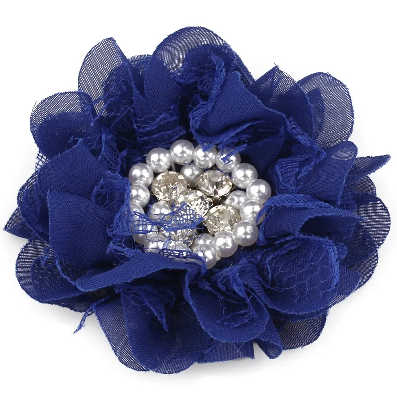 4 шт. 9 см шифоновый кружевной цветок с жемчугом Стразы центр для аксессуаров для волос розетка потертая ткань цветок без зажима