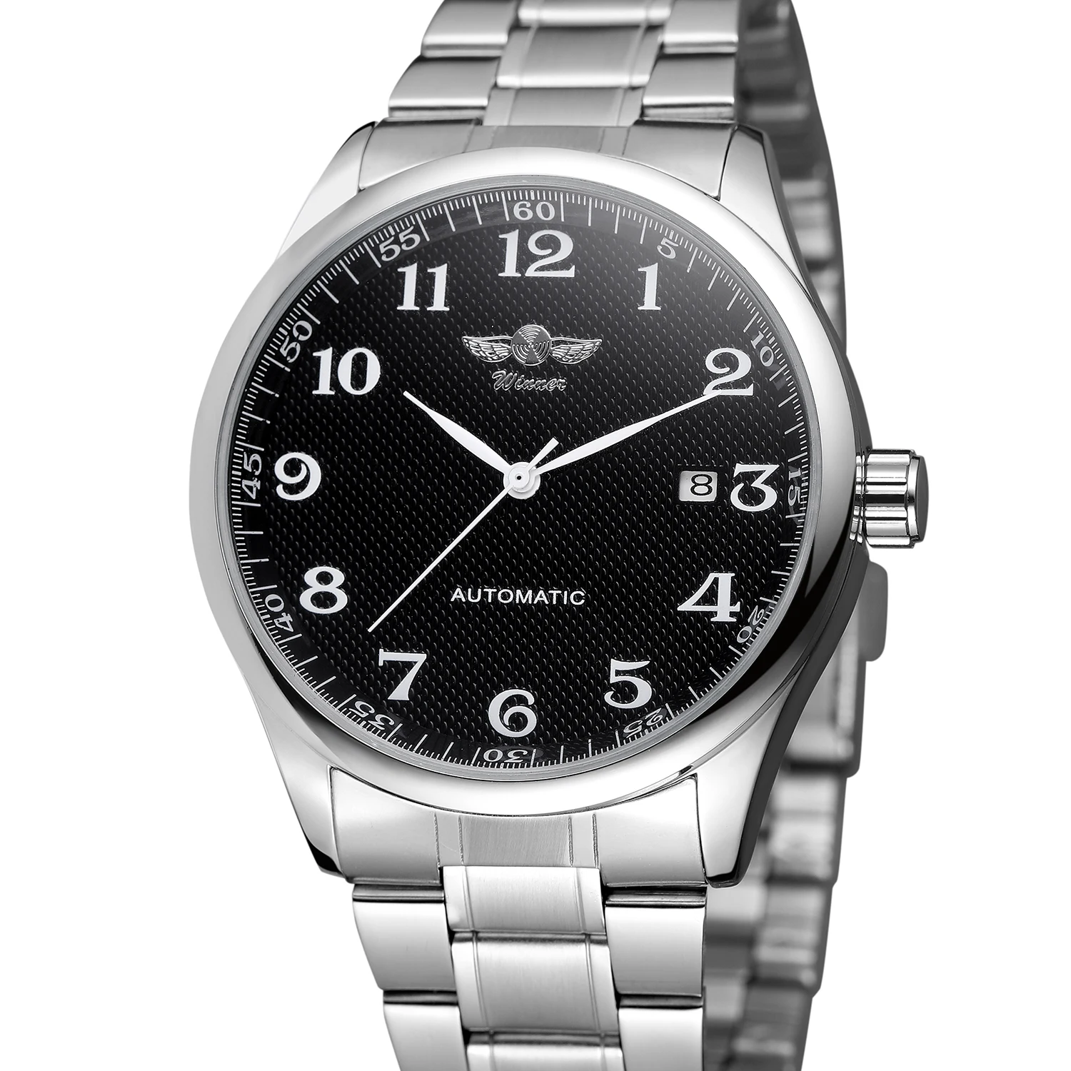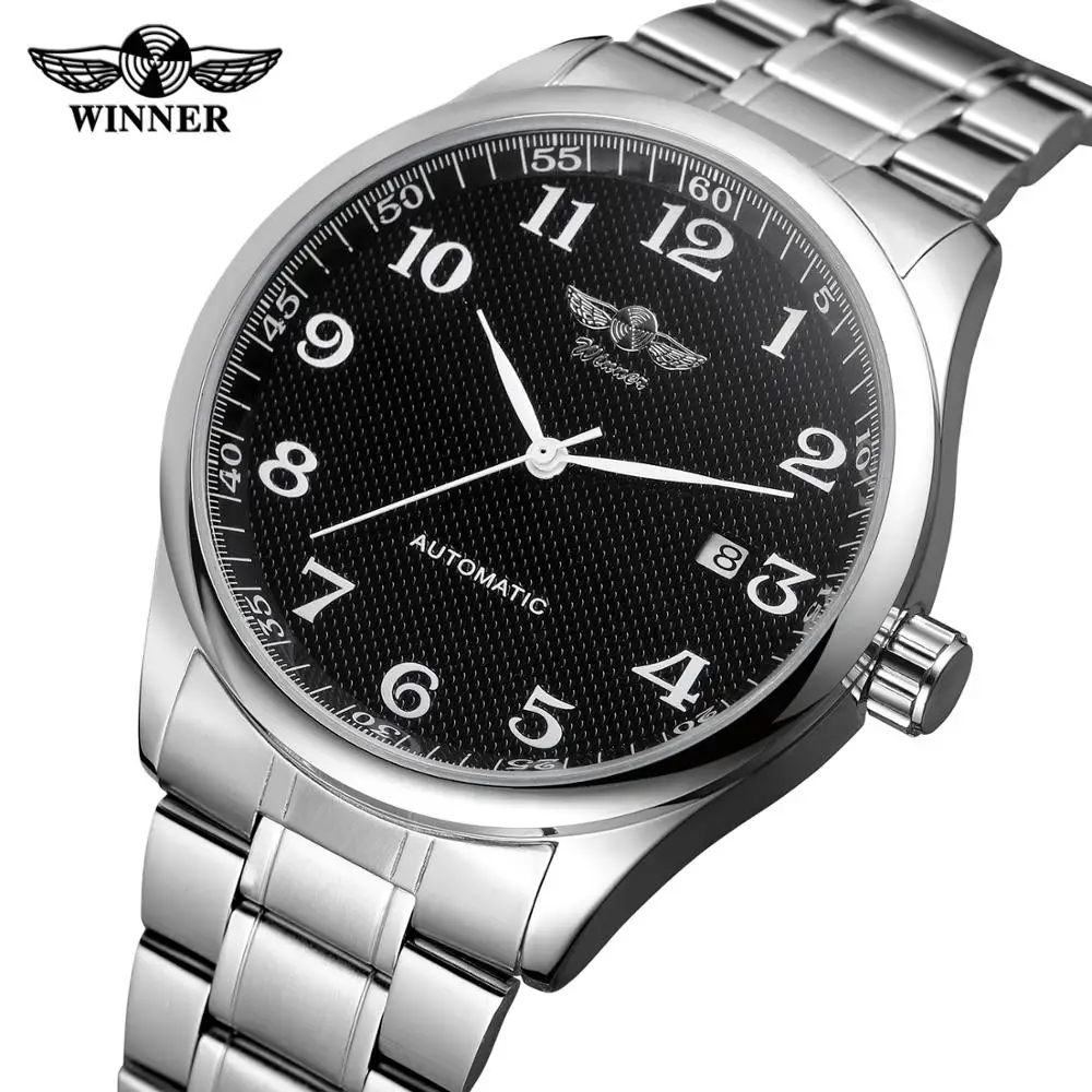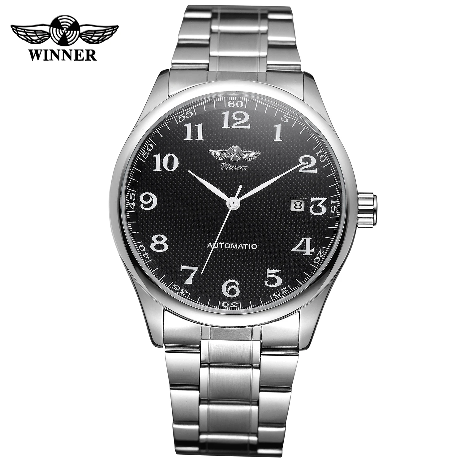 Часы наручные WINNER мужские и женские Автоматические, модные простые механические, с черным циферблатом и ремешком из нержавеющей стали