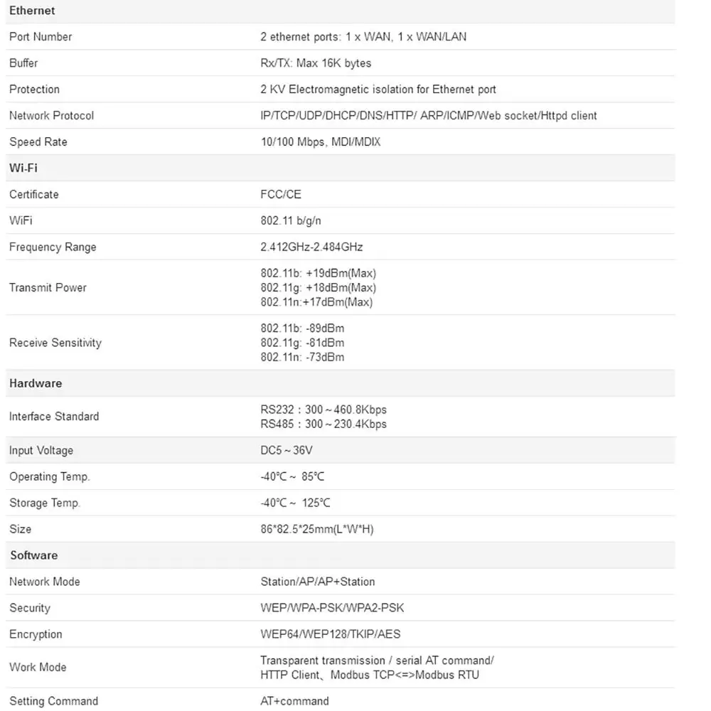 ПерсонажиДва порта Ethernet: 1 WAN, 1 LAN/WAN. Два порта Ethernet (WAN и LAN) могут работать одновременноШлюз Modbus: Modbus TCP-Modbus RTU двунаправленный; Опрос ModbusЭлектростатическая защитаАппаратный сторож, 24 часа стабильной работы.Функция сброса таймаута, функция сброса времени.Поддерживает функцию идентификационного пакета.Поддерживает функцию пульса.Функция WebsocketПоддерживает веб-сервер, программное обеспечение настройки, команды serial/network AT для настройки модуля.Перезагрузка оборудования.Стандарт Wi-Fi: 2,4 ГГц 802.11b/G/NРежим работы: сервер TCP/Клиент TCP/сервер UDP/клиент UDP/режим клиента HTTP.Поддерживает AP, STA, AP + STA.Поддерживает usrlink.EFT: прошел тест EFT, когда в цепи мгновенно появляется большой ток (например, молния, выключатель питания и т. д.), это гарантирует, что оборудование устройства не повреждено.Особые характеристики1. Режим опроса ModbusВ этом режиме он поддерживает взаимное преобразование Modbus TCP и Modbus RTU.2. Функция пульсаUSR-W630 поддерживает сетевое сердцебиение и последовательное сердцебиение. Пакет сердцебиения сети уведомляет сервер о том, что он находится в активном состоянии, и поддерживает нормальное соединение с сервером, непрерывно отправляя пакет сердцебиения.3. Протокол распределения розетокUSR-W630 поддерживает SDP, вы можете добавить определенный заголовок в последовательные данные. Он отправит данные в разные разъемы на разные разъемы. Данные, полученные от разных разъемов, будут добавлены в разные разъемы перед отправкой в последовательный разъем.4. Функция регулярного перезапускаUSR-W610 поддерживает функцию перезапуска времени и таймаута, что делает работу системы более стабильной.