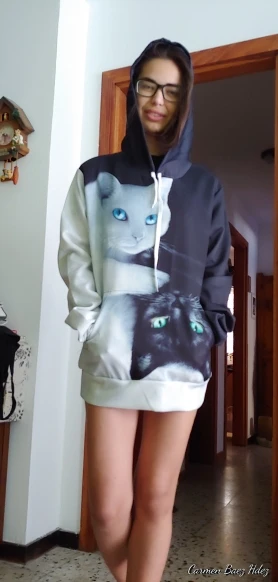 Толстовка выглядит грязной со стороны бело-голубой кошки. Совсем не тёплая, не плотная. На капюшоне шов некрасивый. Синтетика . Не рекомендую.