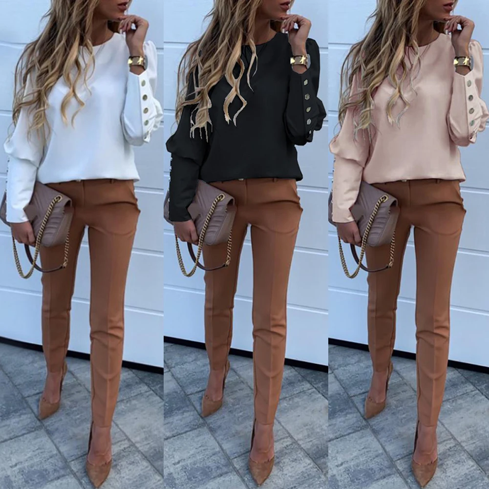 Женская офисная блузка с круглым вырезом, длинным рукавом и пуговицами
