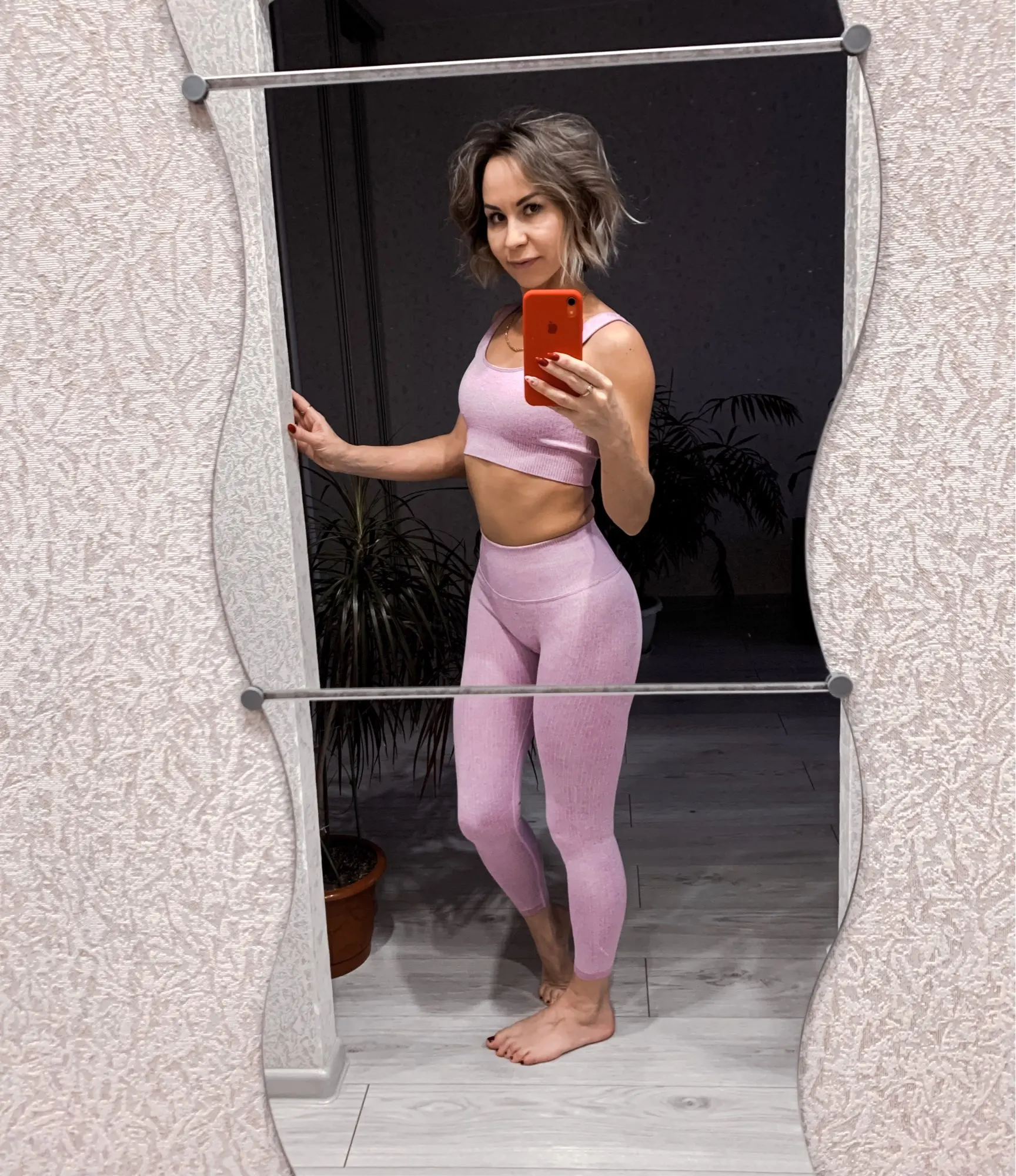 Начиталась отзывов, заказала М, но на ОГ 92 и под грудью 77 топ мал, резинка под грудью давит, лямки короткие, проймы маленькие, что шов врезается в подмышки, аж руки немеют. На фото видно, какие складки подмышками и как врезается ткань в кожу. Лосины на рост 173 см по длине нормальные, но и их тоже надо было заказывать на размер больше, еле натянула. На От 77 нормально, не давит, бедра 94 см, вес 59 кг. Лосины просвечивают, белье видно. на фото отобразила.